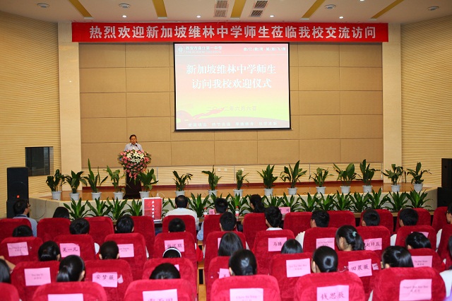 欢迎仪式上,我校常务副校长陈勇刚首先致欢迎辞,他表达了对新加坡维林中学的诚挚欢迎,同时希望中新双方学生能通过此次交流活动更深入地了解两国文化,结下深厚情谊,搭起友谊之桥。随后,新加坡联合早报游学团团长沈茂华先生致答谢辞。他表示非常感谢有这个机会能让中新两校学生进行深入交流。在这个有着悠久历史的城市里,他相信学生会学到更多知识,更努力地了解中国的历史文化与日常生活,领略中国的文化与魅力。
