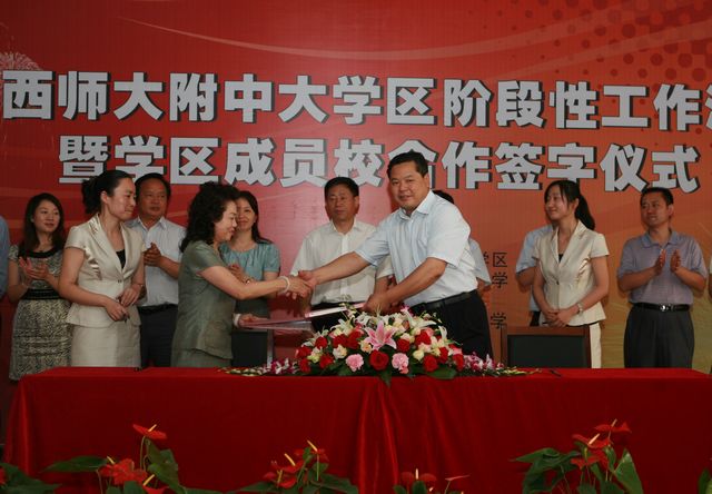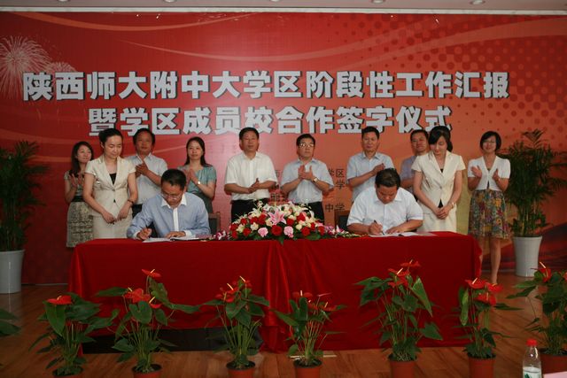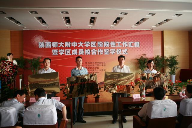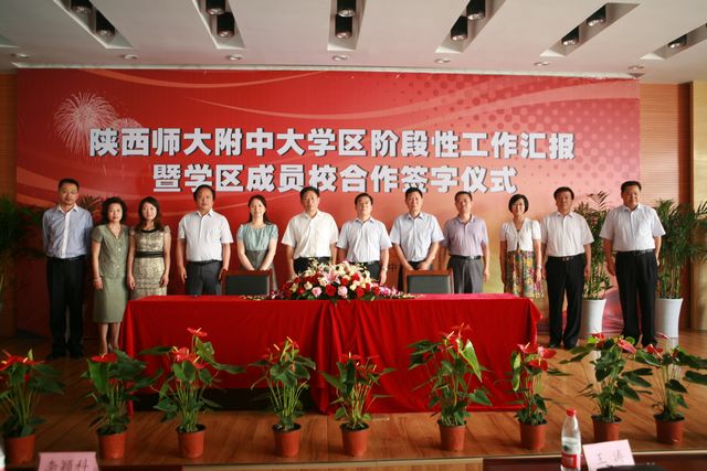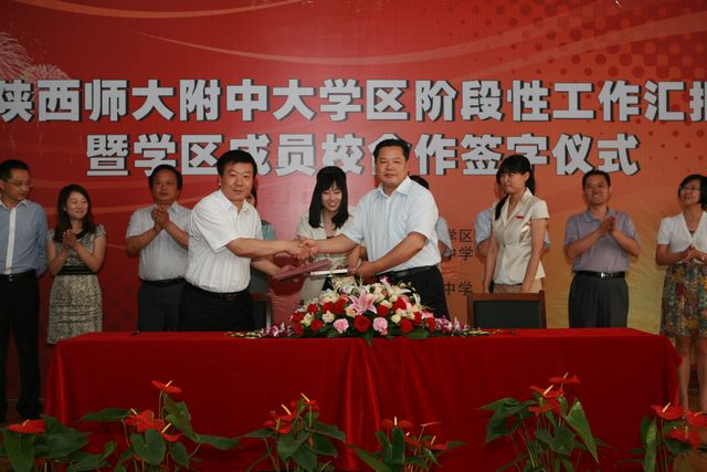 为了继续推动区域基础教育的均衡发展,检验阶段性工作成果,加快推进师大附中大学区相关工作的有效落实,努力达到大学区成员学校的合作共生,2012年6月17日上午9时,在陕西师范大学附属中学召开了“陕西师范大学附中大学区阶段性工作汇报”会议暨学区成员校合作签字仪式。与会的主要领导有陕西师范大学党委副书记王涛、西安市教育局党委书记、局长李颖科、雁塔区人民政府副区长张秦、西安市教育局基教处处长田征、雁塔区教育局局长李占良、副局长徐三雄等。学区长陕西师范大学附中校长边团结、曲江一中常务副校长陈勇刚、副校长曹琦、西安第九十九中学校长王春生、西安明达学校管委会董事长苏进军等携优秀教职工代表也参加了本次会议。