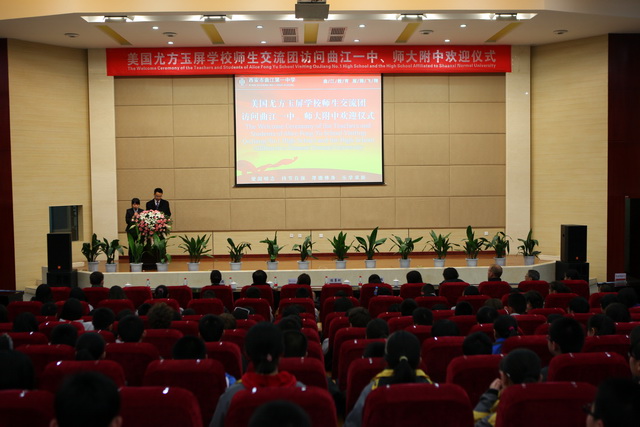 当日下午五时,我校举行了隆重的欢迎仪式,仪式由校办兼政教主任余爱东主持。出席欢迎仪式的领导和嘉宾有师大附中党总支副书记兼曲江一中常务副校长陈勇刚、师大附中政教主任邓小鹰、初一年级组长万琼、曲江一中总务主任王锦、校办副主任申小娟、美国尤方玉屏中学司徒校长。中美三校近两百位师生家长参加了欢迎仪式。