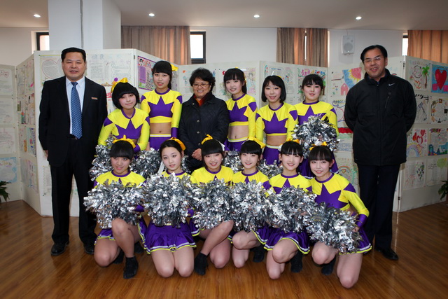 李卫红副部长、房喻校长、边团结校长与啦啦操队员合影