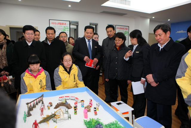 抵达学校后,李卫红副部长一行先视察我校心理发展指导中心。在认真听取了我校心理发展指导中心的简要汇报、观看了活力动感的心理释放操——啦啦操表演和心理小组的沙盘游戏后,李部长对我校认真贯彻落实《教育部关于加强中小学心理健康教育的若干意见》精神,通过多种形式积极加强学生心理健康教育、重视学生身心发展的做法表示了高度认可。她强调,对学生的心理健康教育应以预防为主,同时也要注意关注教师的心理健康。
