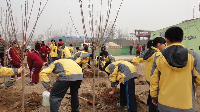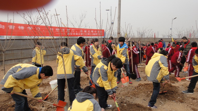 下午14:30,同学们在政教处李静老师及班主任老师的带领下,迎着春风,踏着芬芳,来到了曲江国际园在建广场参加义务植树活动。在现场工作人员说明了植树的要求和方法之后,同学们热情高涨,开始行动了。平常连锄头都没有摸过的同学们,此刻却有板有眼地当起了“园艺工程师”。大家分工合作,有的挖坑、有的扶树苗、有的浇水……热闹的场面忙绿而快乐。一眨眼的功夫,在同学们的辛勤劳动下,树苗便“亭亭玉立”在沃土上。虽然大家脚底全是泥土,身上被溅了泥水,但眼前这一片新生的绿意让大家满心欢喜。