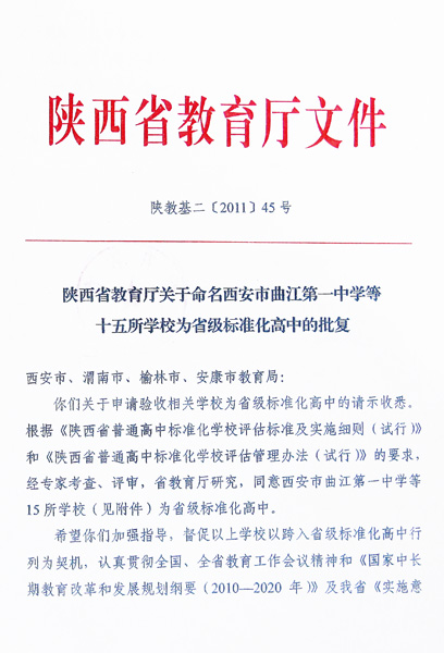 根据陕西省教育厅《陕西省教育厅关于命名西安市曲江第一中学等十五所学校为省级标准化高中的批复》(陕教基二【2011】45号)文件,曲江第一中学顺利晋升为省级标准化高中。