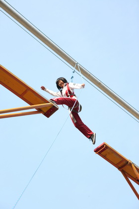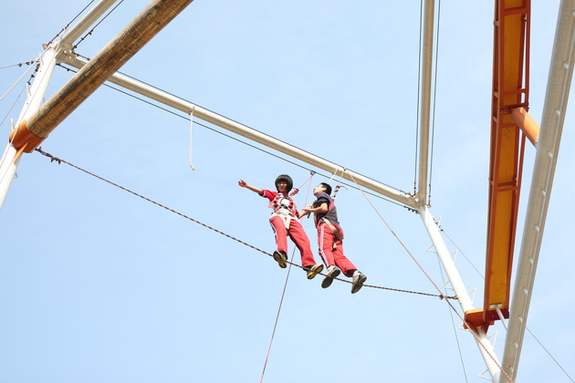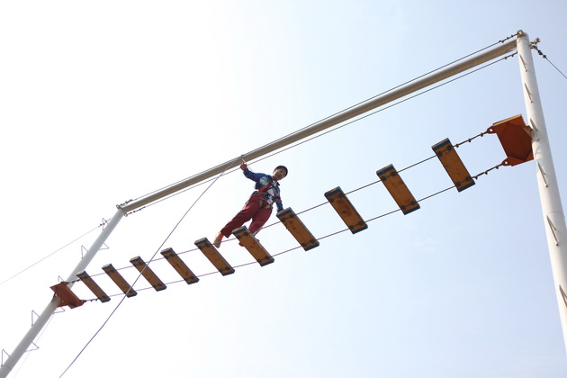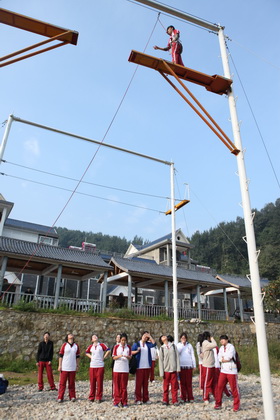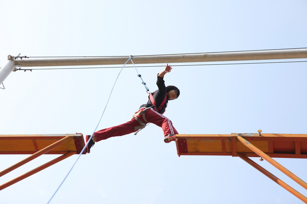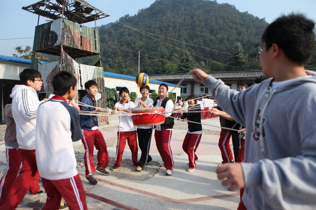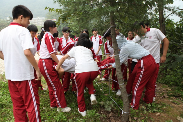 刚到拓展基地,同学们的热情就被点燃,个个跃跃欲试。在营地教官的安排下,整个高二年级被分为11个小队展开活动。第一个拓展项目是缅甸桥——高空行走。八米高空中悬浮的断桥、铁索、软梯都成为学生们首先面临的挑战,每一个成员都必须在有限的时间内顺利爬上高空,完成行走。短短的一个小时中,同学们见证了彼此的挑战过程,从胆怯、迟疑到最后的勇敢攀登,每个人都在努力克服自己心中的恐惧。而当有同学无法挑战成功时,队友们热情的齐声呐喊也成了鼓励彼此克服挑战的动力。