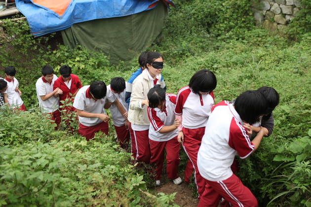 拓展训练的最后一个项目“盲人行走”是令很多同学感触颇多的一个环节。在被蒙住眼睛之后,大家只能靠完全的信任听凭引导者——“聋哑人”的带领,穿越山林和小路,而在摘掉眼罩的瞬间,大家也体会到了光明和信任的重要性。同学们热情地相互拥抱,表达着彼此的感激,激动的同学们甚至将一同参与拓展的陈勇刚校长抛入空中,欢呼感谢,用最兴奋的心情表达着自己的感恩之心。18:00,活动结束,同学们在欢歌笑语中踏上了返校的路程。