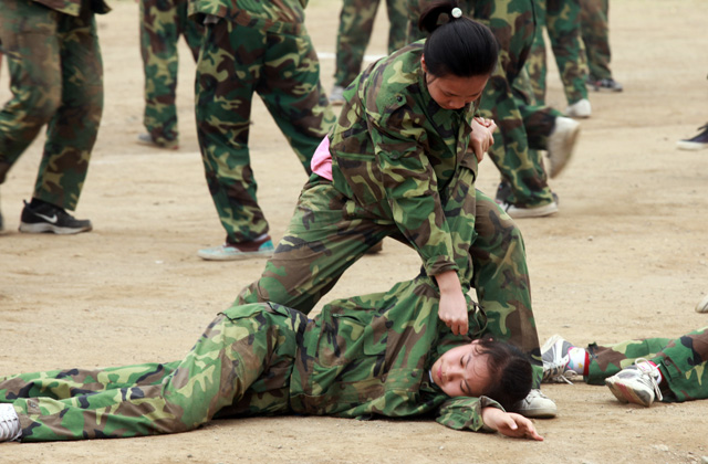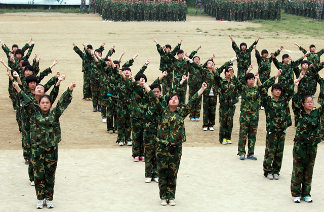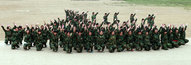 那边,女子文明礼仪方队也在紧张的排练中,他们喊着“八荣八耻”,摆出扬帆远航的造型,随着音乐的响起,整齐地做着《感恩的心》的手语。与男子汉们脸上的坚毅不同的是,他们的脸上显出发自内心的对父母的感恩,对老师,长辈们的感恩以及对同学朋友的感恩。
