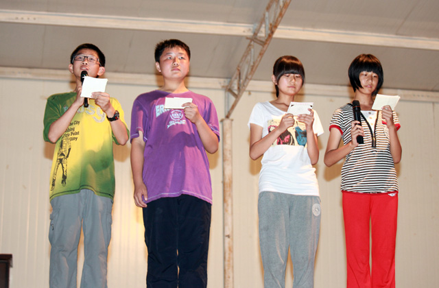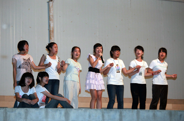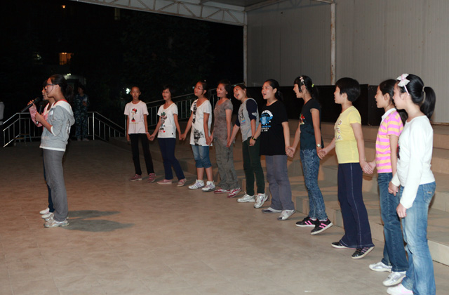 天色暗了,但军训基地的操场却成了一片欢乐的海洋。师大附中与曲江一中所有的参训的孩子们聚集在操场上,享受着一场属于自己的晚会,一场特殊的晚会,多样的节目扫除了同学们身体的疲倦,给心灵带来了一丝丝清凉,祝愿所有的孩子们有一个香甜的梦。看着他们充满灿烂的笑容,我们有理由相信孩子们明天一定能以最好的状态完成任务。