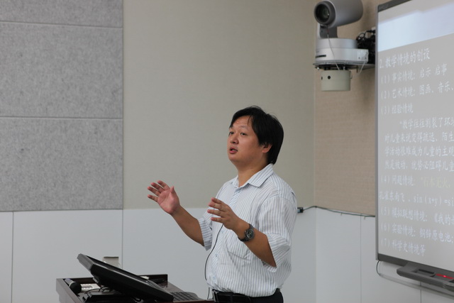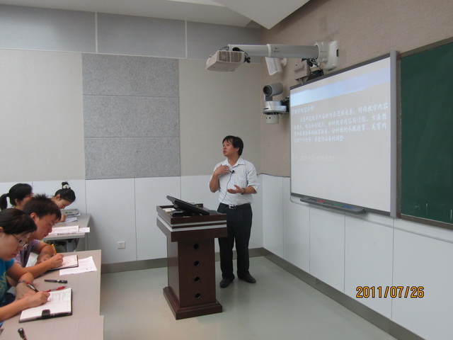 下午阶段,“教学设计能力培养专题”在陕西师范大学化学与化工学院严文法老师的倾情讲述中开始了美妙的探索。严老师教法严谨规矩,课堂安排紧凑、内容丰富。他从教学设计的历史沿革、原理策略、主要环节、课时教学设计等四方面展开课程,在期间提供诸多经典案例供老师们共同探讨。尤其在教学目标的设计上针对三维目标,严老师举出翔实资料以便在座老师们有更加理性的认知和清晰的判别。从而对青年教师的备课、教学设计等行为起到有效的帮助和规范作用。
