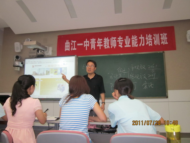 张副教授深入浅出,把理论与实践相结合,主要从网络资源和PPT应用两大部分给年轻教师们打开了一扇思维之窗。由于张副教授也参与了曲江一中第一届赛教课的评委工作,对各位老师的信息技术应用水平有一定了解,他由理科组第一名杨光辉老师的赛教课课件评点入手,又提供了几份颇具影响力的幻灯片,使老师们既形象地了解了优秀幻灯片的制作,又深刻意识到技术的力量充斥在我们身边,给教学提供了很大方便。