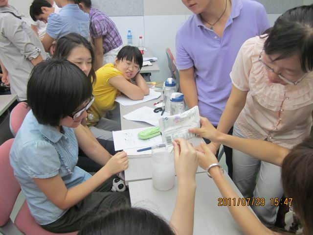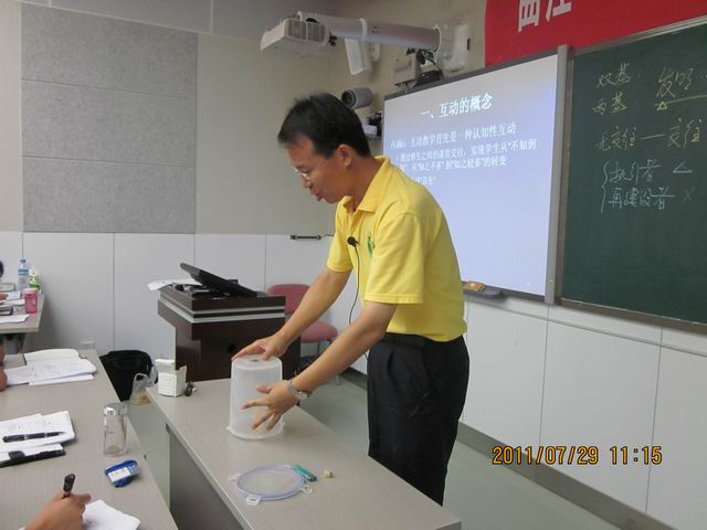 在理论介绍的过程中,李老师发挥互动课堂的优势,穿插丰富多样的课堂活动。他播放了大量的课堂实录片段,如《吨的认识》、《小羊多利找妈妈》、《浪之歌》、《掌声》等。这些课程涉及不同学科、不同年级,老师们直观地感受到互动课堂的效果,积累一手经验。此外,李老师精心准备了实验器材,让老师们在现场动手实验,如触觉感受器实验、高低蜡烛燃烧实验、墨水滴水中扩散实验等。老师们仿佛又回到中学时代,在积极参与实验的过程中体验到了互动的乐趣和价值。一天的课程在老师们的热烈掌声中结束。让课堂动起来,我们的教学在互动中会更有趣、更高效。
