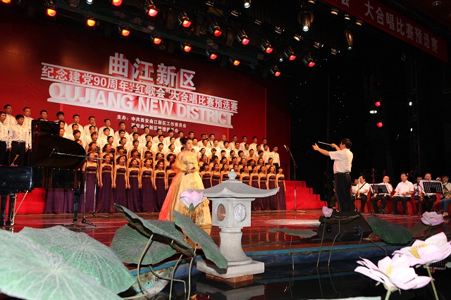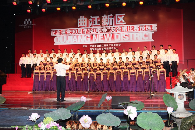 曲江新区纪念建党90周年红歌大合唱比赛以“共建和谐社会,红唱曲江”为宗旨,使来自不同单位和团体的人们欢聚在一起,歌唱建党90周年,用歌声表达对党的感情。