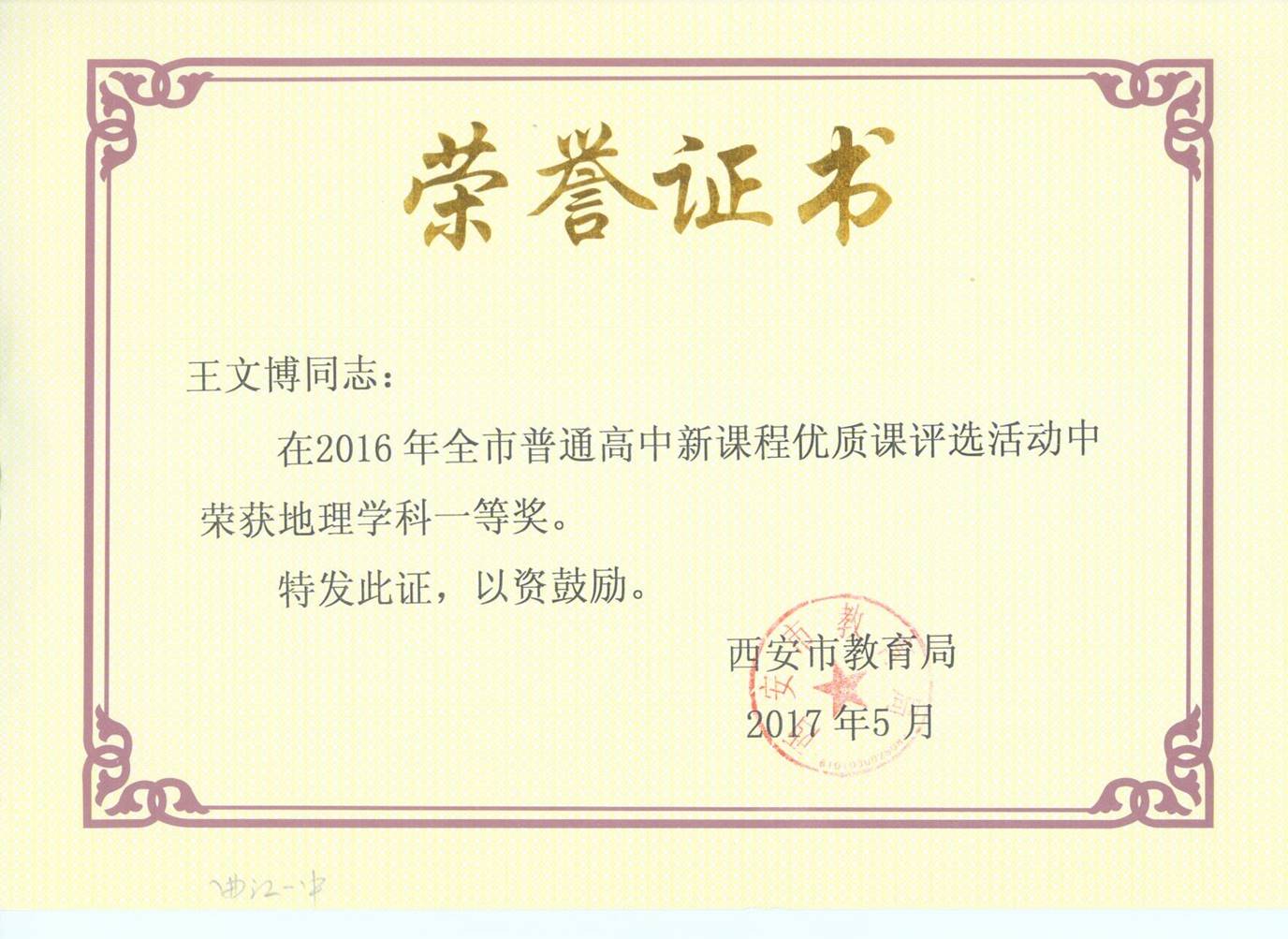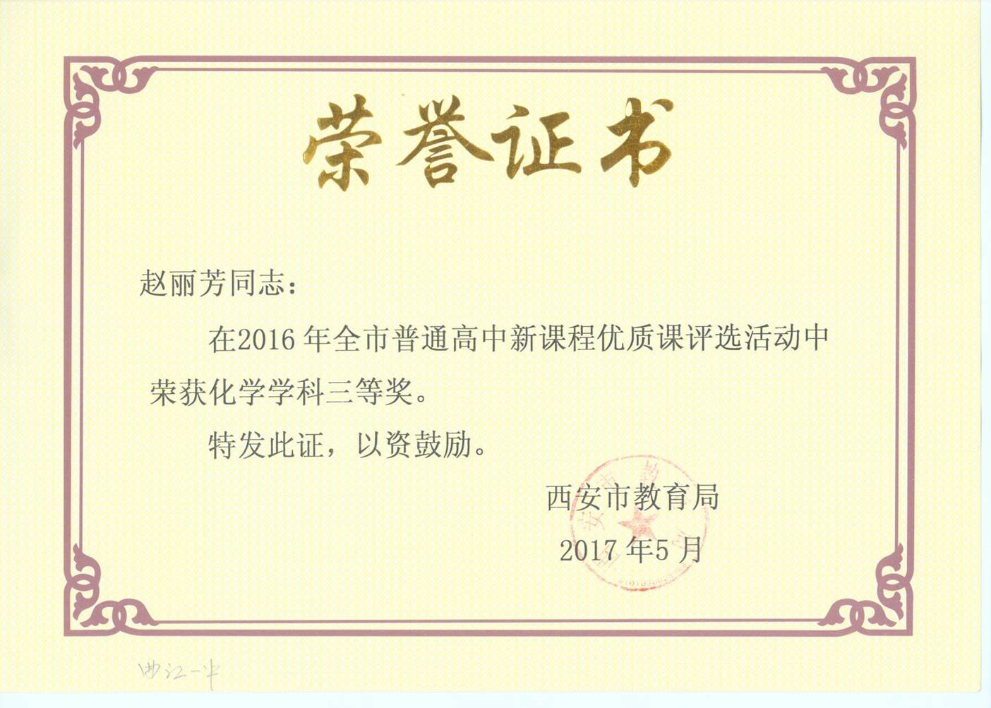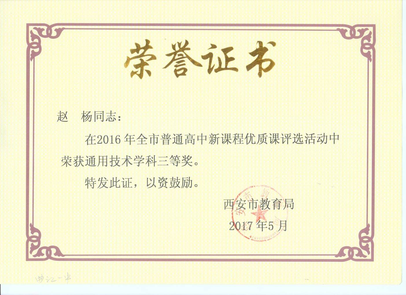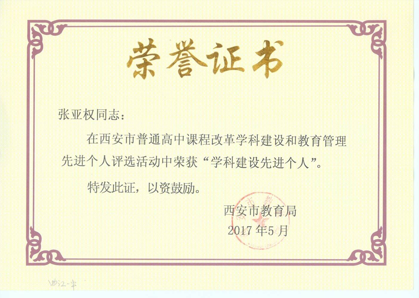2017年5月,在西安市普通高中课程改革学科建设和教育管理先进个人评选活动中,张亚权老师荣获“学科建设先进个人”。