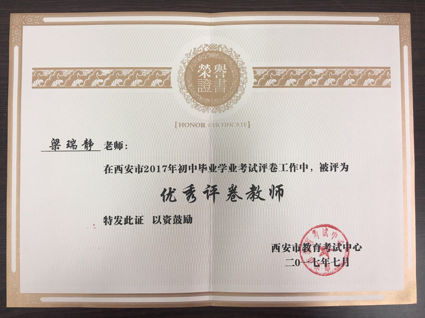 2017年7月,在西安市2017年初中毕业学业考试网上评卷工作中,梁瑞静老师被评为优秀阅卷教师。