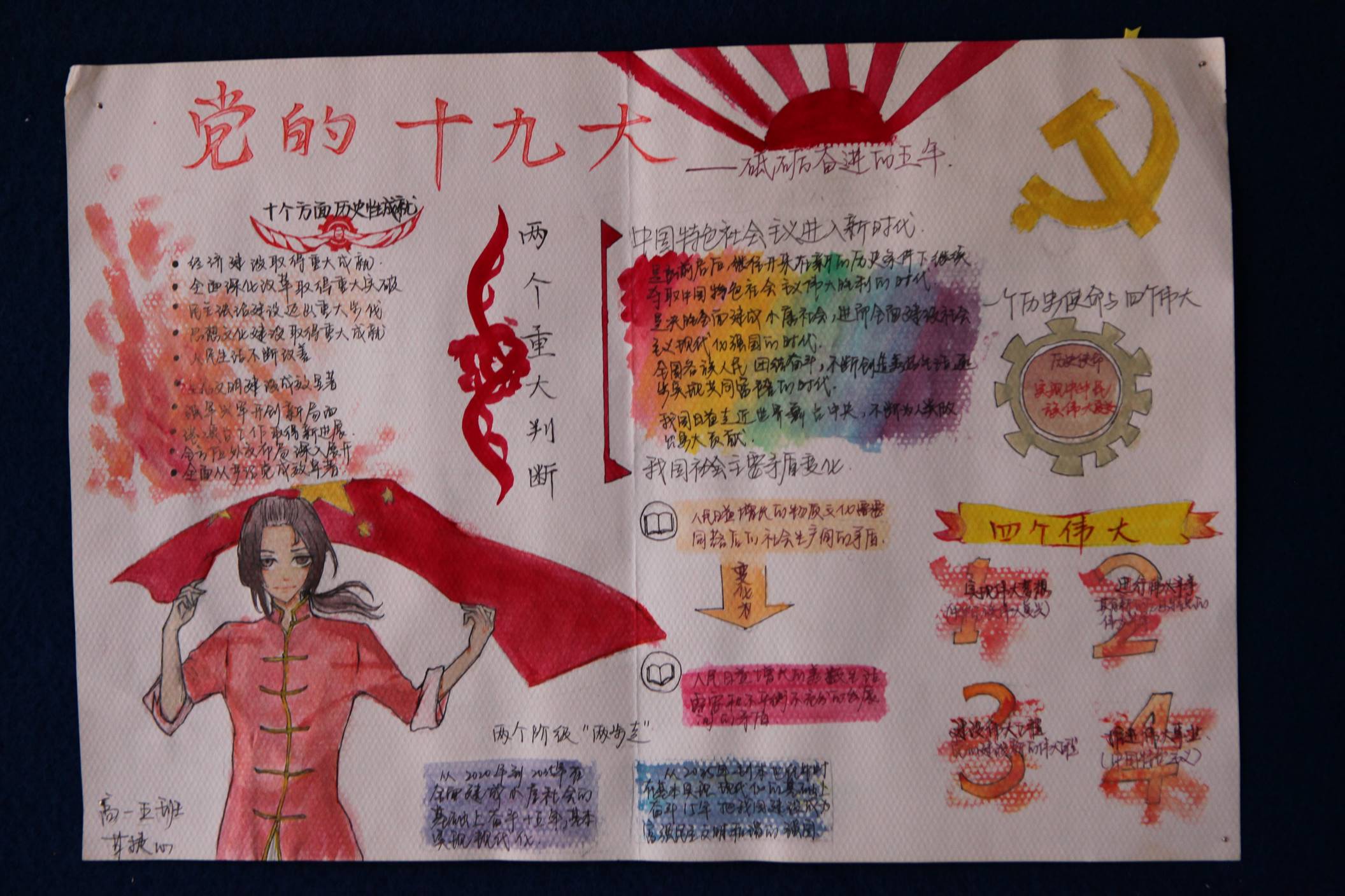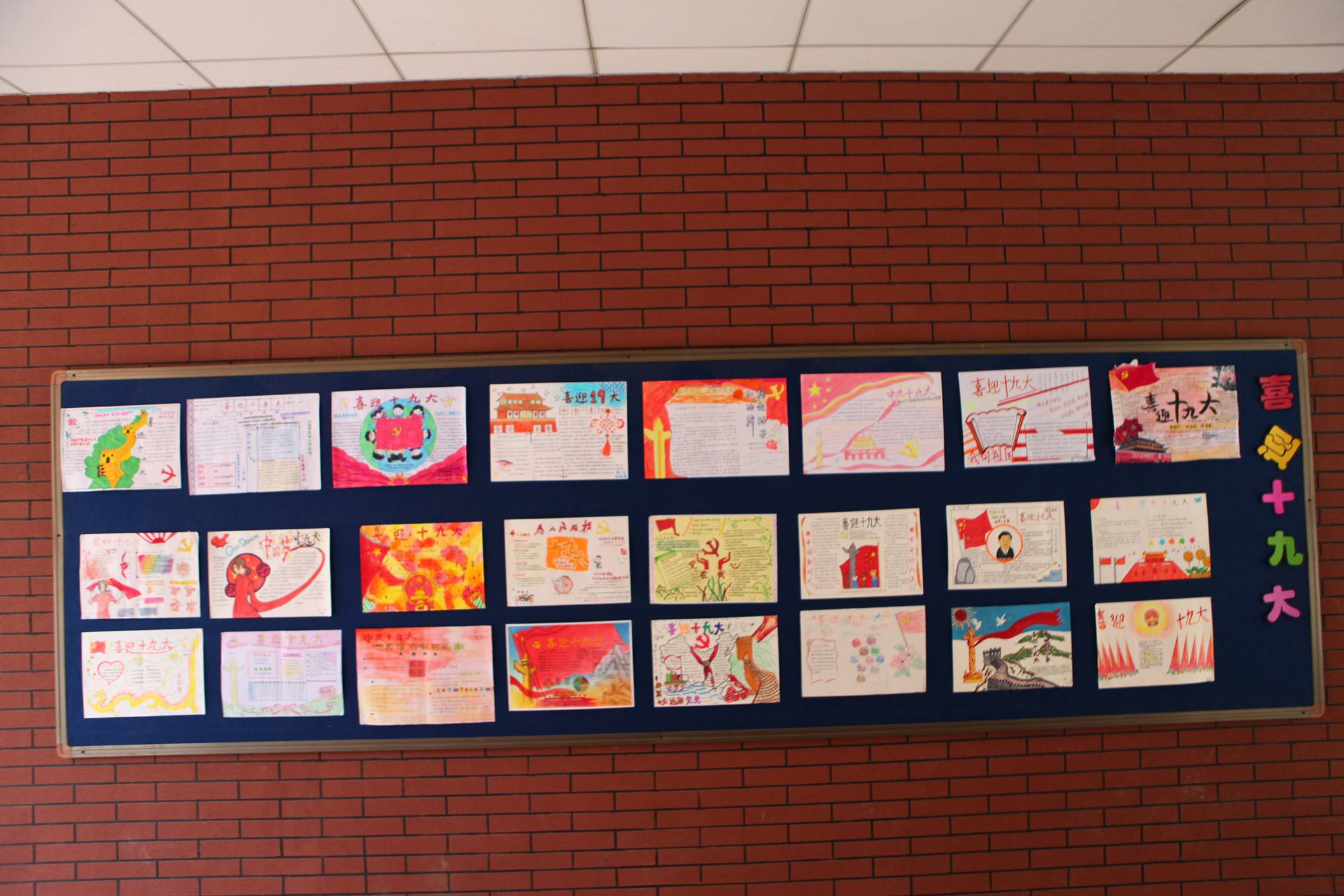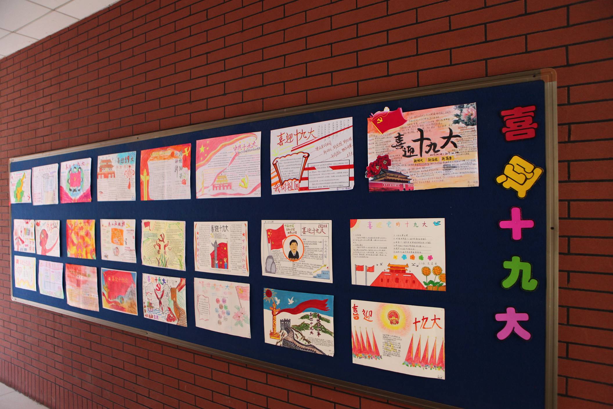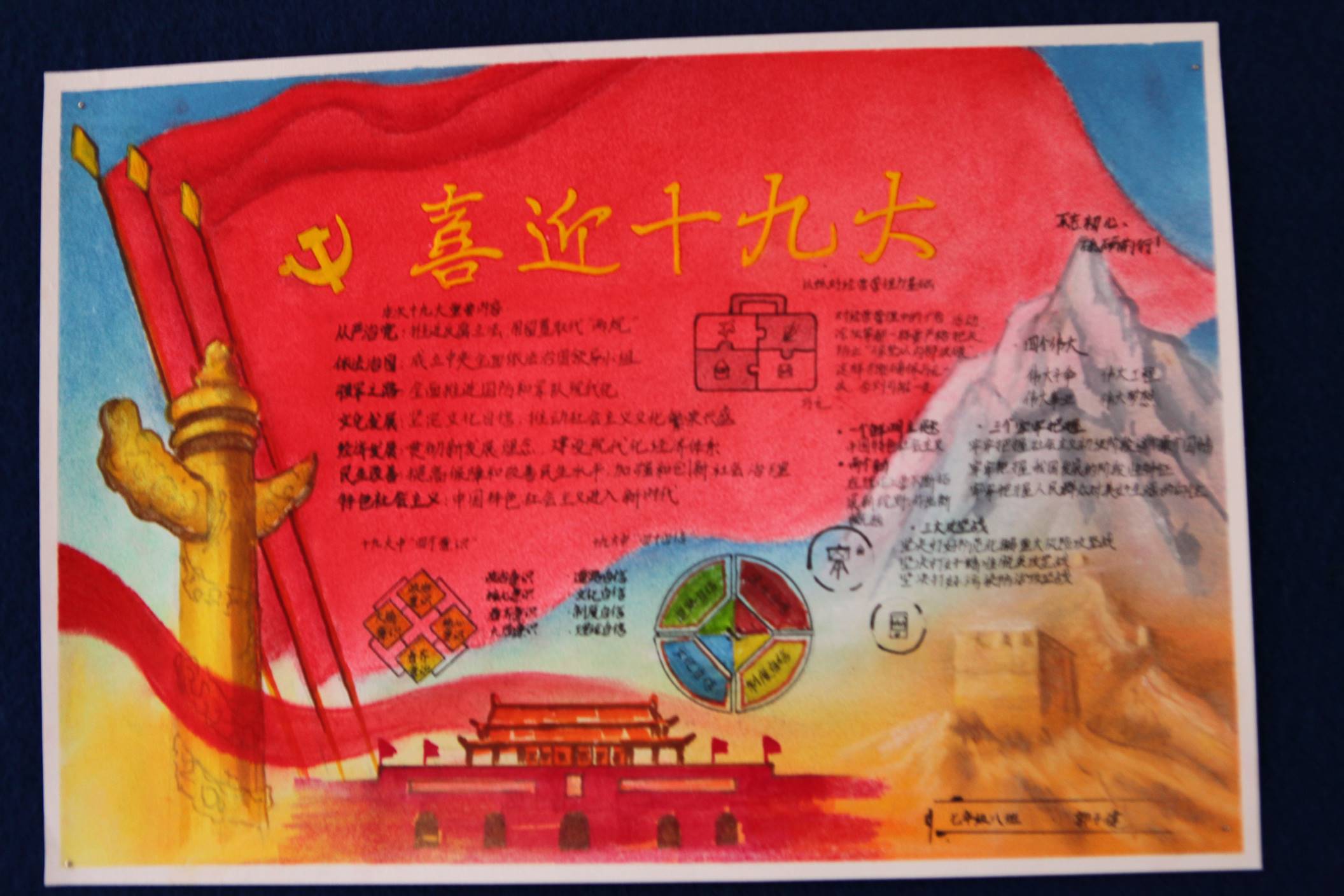 五年耕耘、砥砺奋进,全党全国各族人民不仅迎来了丰收的喜悦,更是在满满当当的成就感中,激发了对美好生活的向往与发展前景的更高期待。为了响应党的十九大,曲江一中政治教研组联手学校政教处在七年级和高一年级展开了以“喜迎十九大、共筑中国梦”为主题的手抄报比赛。学生们积极响应,踊跃参加,共收到来自初高中不同班级的七百余份手抄报作品。曲一学子纷纷通过自己的视角和画笔,从经济建设、政治建设、文化建设、社会建设、生态文明建设、国防和军队建设、“一国两制”实践、中囯特色大国外交、党的建设等方面全景展示了党的十八大以来我们党和国家取得的辉煌成就,催人奋进。学生们结合传统剪纸、创意手绘等方式,描绘出各自心中的祝福,以表达对我们伟大的党和国家的热爱之情,喜迎党的十九大召开。