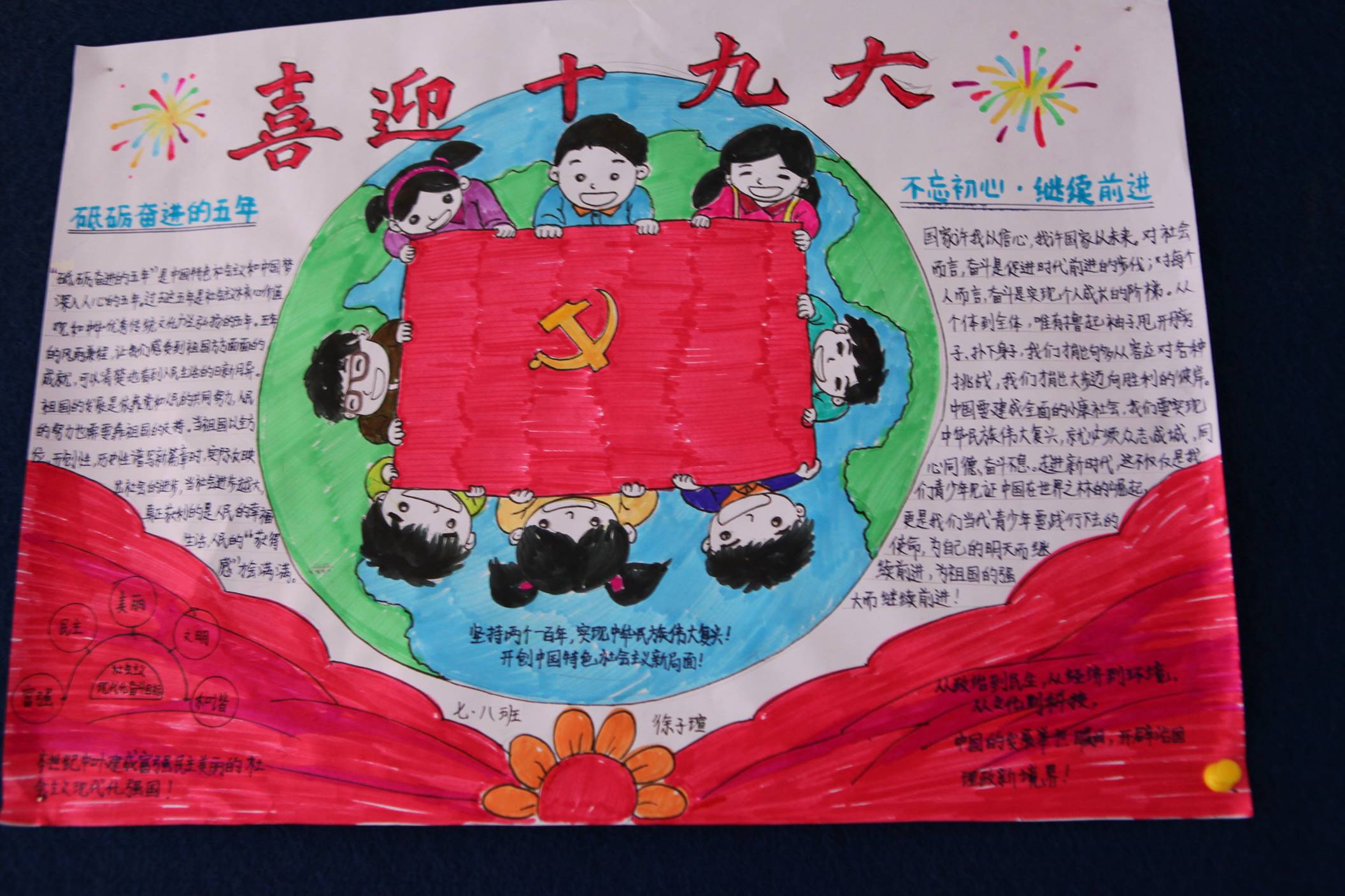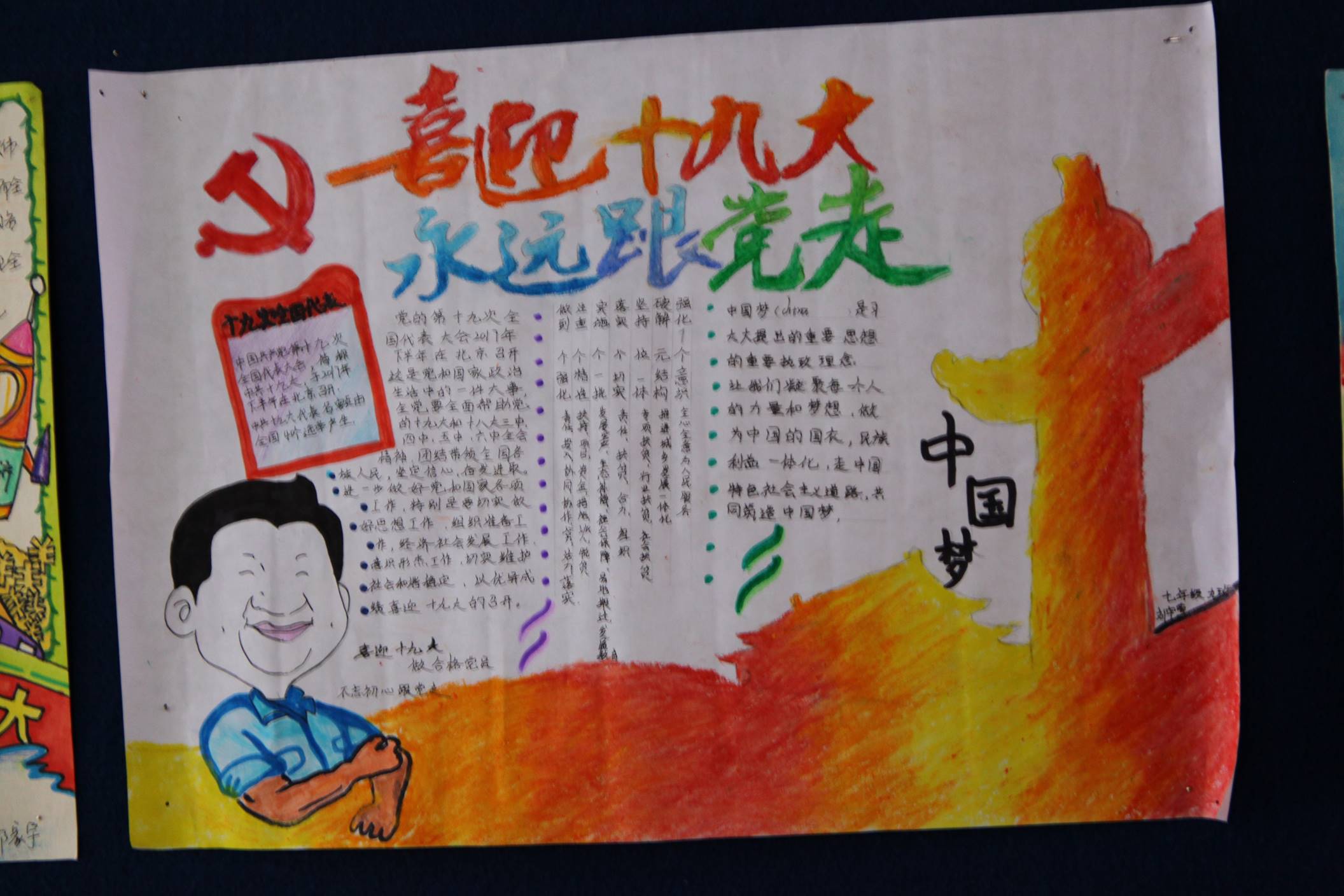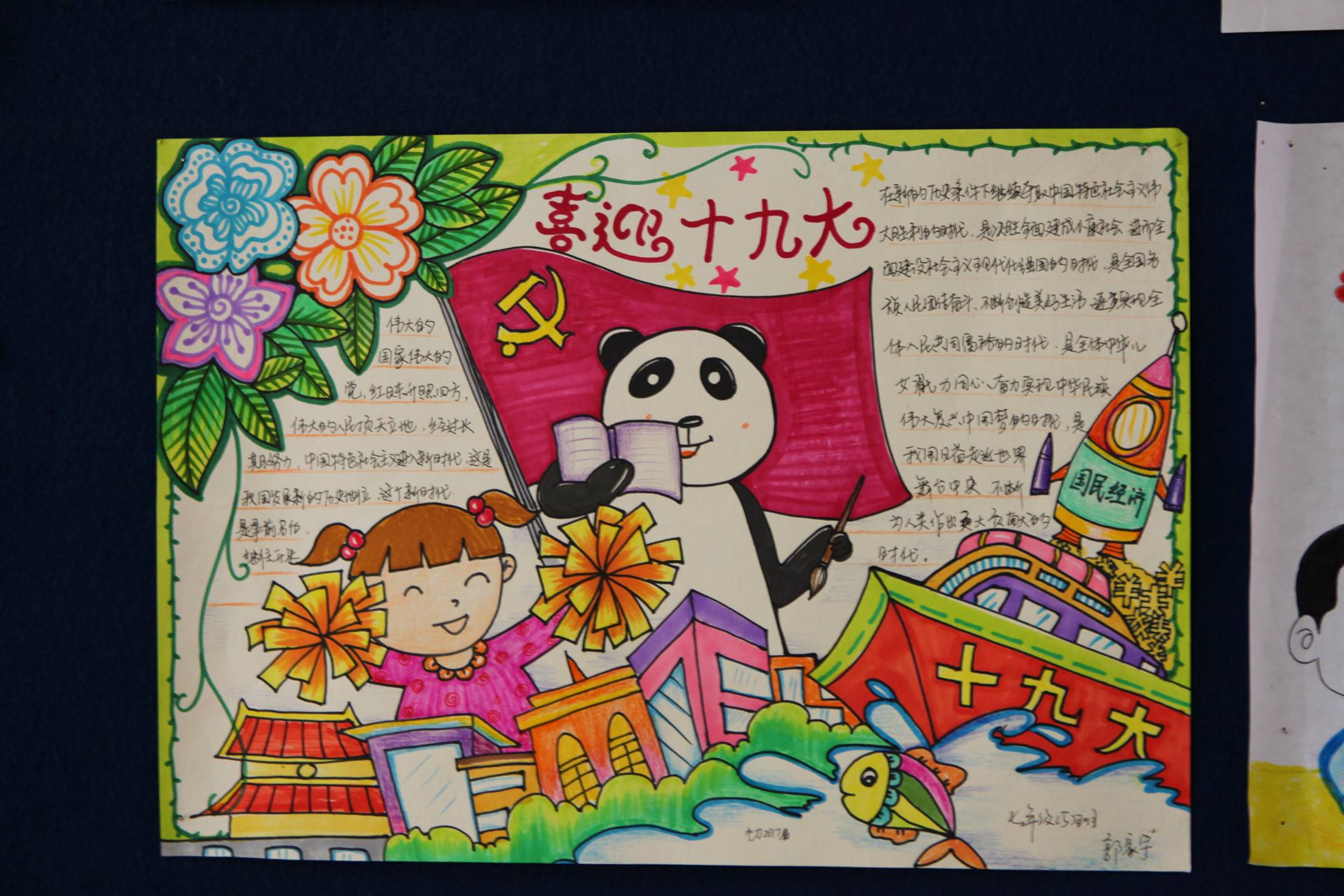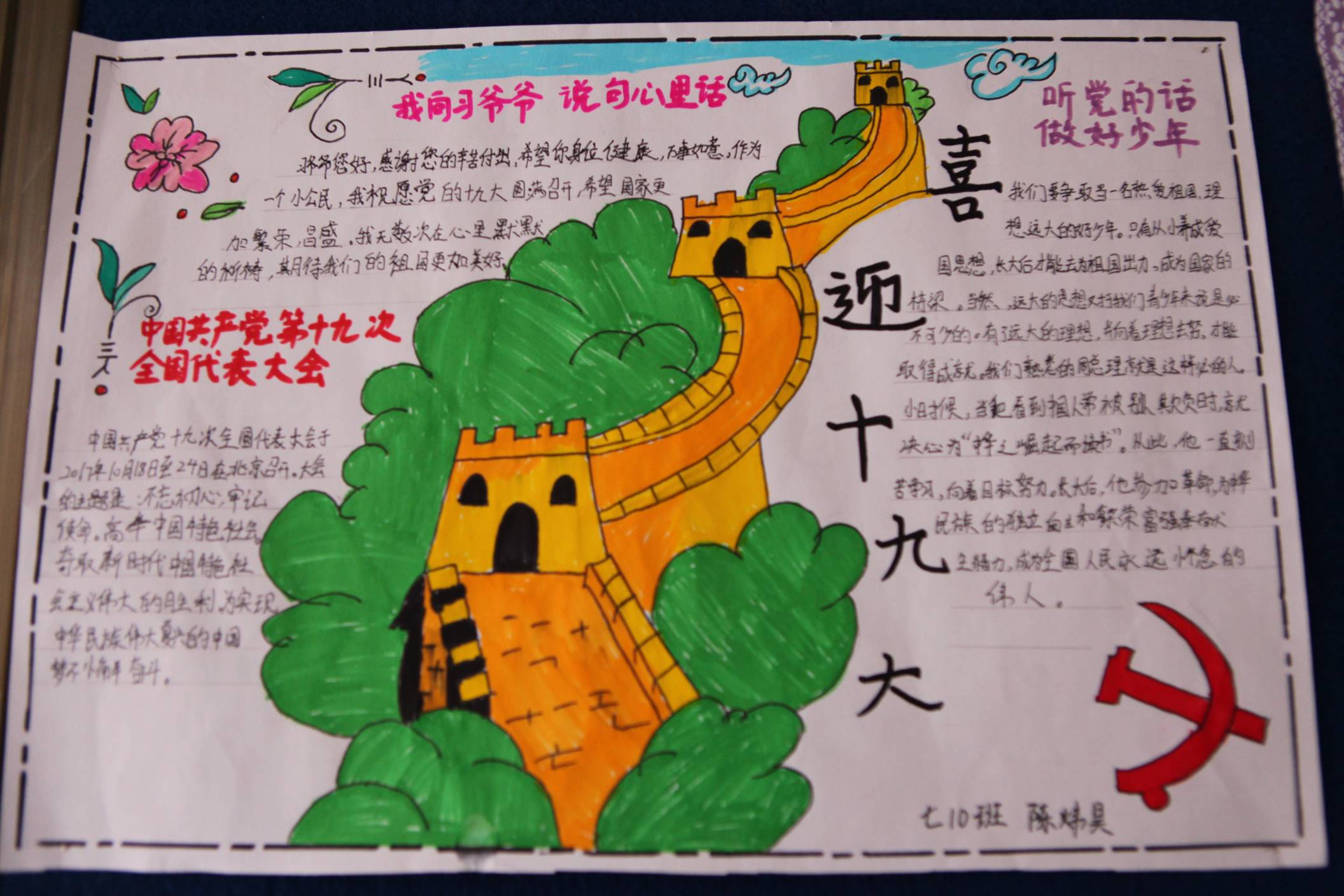 五年耕耘、砥砺奋进,全党全国各族人民不仅迎来了丰收的喜悦,更是在满满当当的成就感中,激发了对美好生活的向往与发展前景的更高期待。为了响应党的十九大,曲江一中政治教研组联手学校政教处在七年级和高一年级展开了以“喜迎十九大、共筑中国梦”为主题的手抄报比赛。学生们积极响应,踊跃参加,共收到来自初高中不同班级的七百余份手抄报作品。曲一学子纷纷通过自己的视角和画笔,从经济建设、政治建设、文化建设、社会建设、生态文明建设、国防和军队建设、“一国两制”实践、中囯特色大国外交、党的建设等方面全景展示了党的十八大以来我们党和国家取得的辉煌成就,催人奋进。学生们结合传统剪纸、创意手绘等方式,描绘出各自心中的祝福,以表达对我们伟大的党和国家的热爱之情,喜迎党的十九大召开。