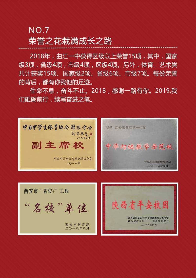 2018年,曲江一中获得区级以上荣誉15项,其中,国家级3项,省级4项,市级4项,区级4项。另外,体育、艺术类共计获奖15项、国家级2项、省级6项、市级7项。每份荣誉的背后,都有你我他的足迹。