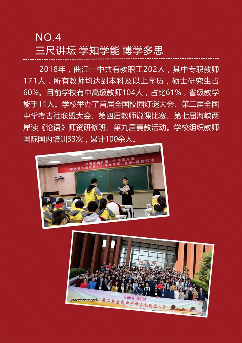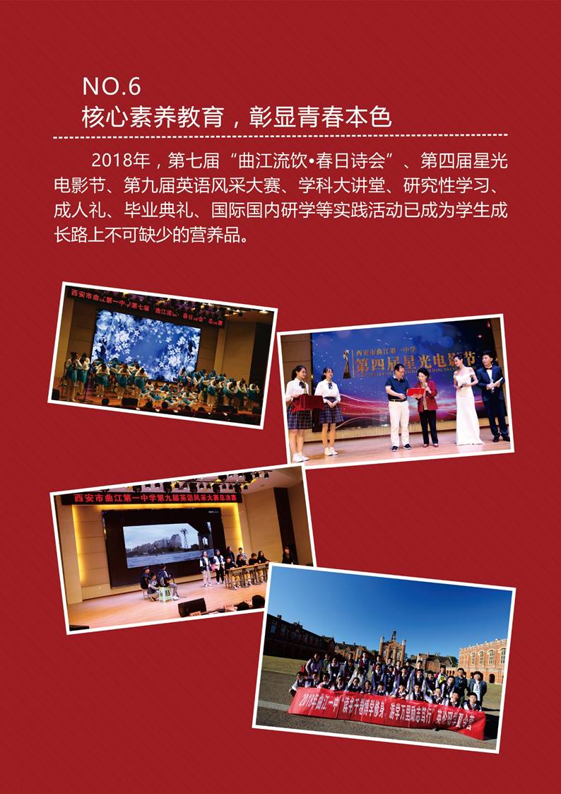 2018年,第七届“曲江流饮•春日诗会”、第四届星光电影节、第九届英语风采大赛、学科大讲堂、研究性学习、成人礼、毕业典礼、国际国内研学等实践活动已成为学生成长路上不可缺少的营养品。
