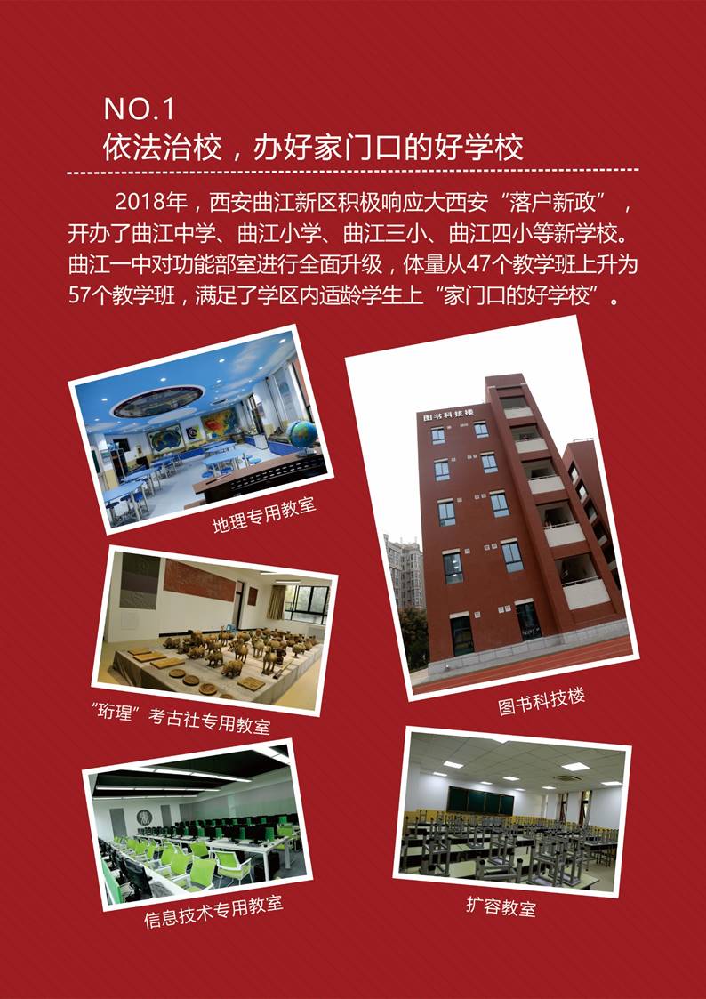 2018年,西安曲江新区积极响应大西安“落户新政”,开办了曲江中学、曲江小学、曲江三小、曲江四小等新学校。曲江一中对功能部室进行全面升级,体量从47个教学班上升为57个教学班,满足了学区内适龄学生上“家门口的好学校”。