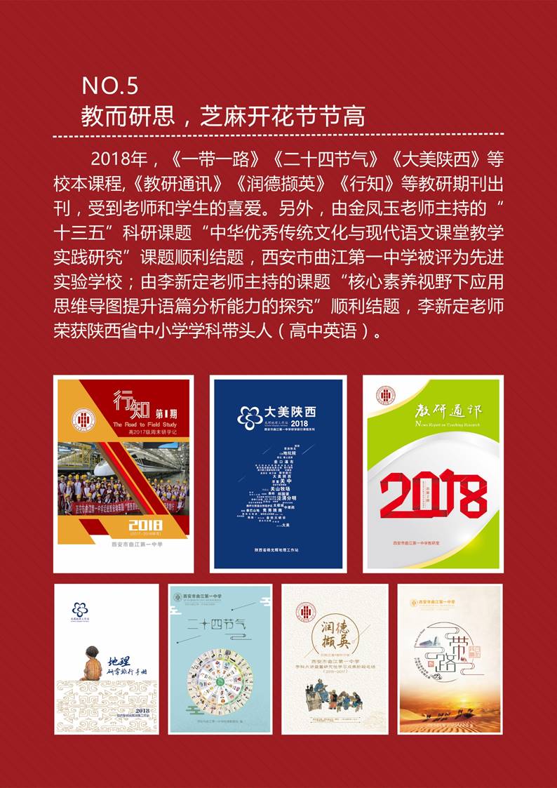 2018年,《一带一路》《二十四节气》《大美陕西》等校本课程,《教研通讯》《润德撷英》《行知》等教研期刊出刊,受到老师和学生的喜爱。另外,由金凤玉老师主持的“十三五”科研课题“中华优秀传统文化与现代语文课堂教学实践研究”课题顺利结题,西安市曲江第一中学被评为先进实验学校;由李新定老师主持的课题“核心素养视野下应用思维导图提升语篇分析能力的探究”顺利结题,李新定老师荣获陕西省中小学学科带头人(高中英语)。
