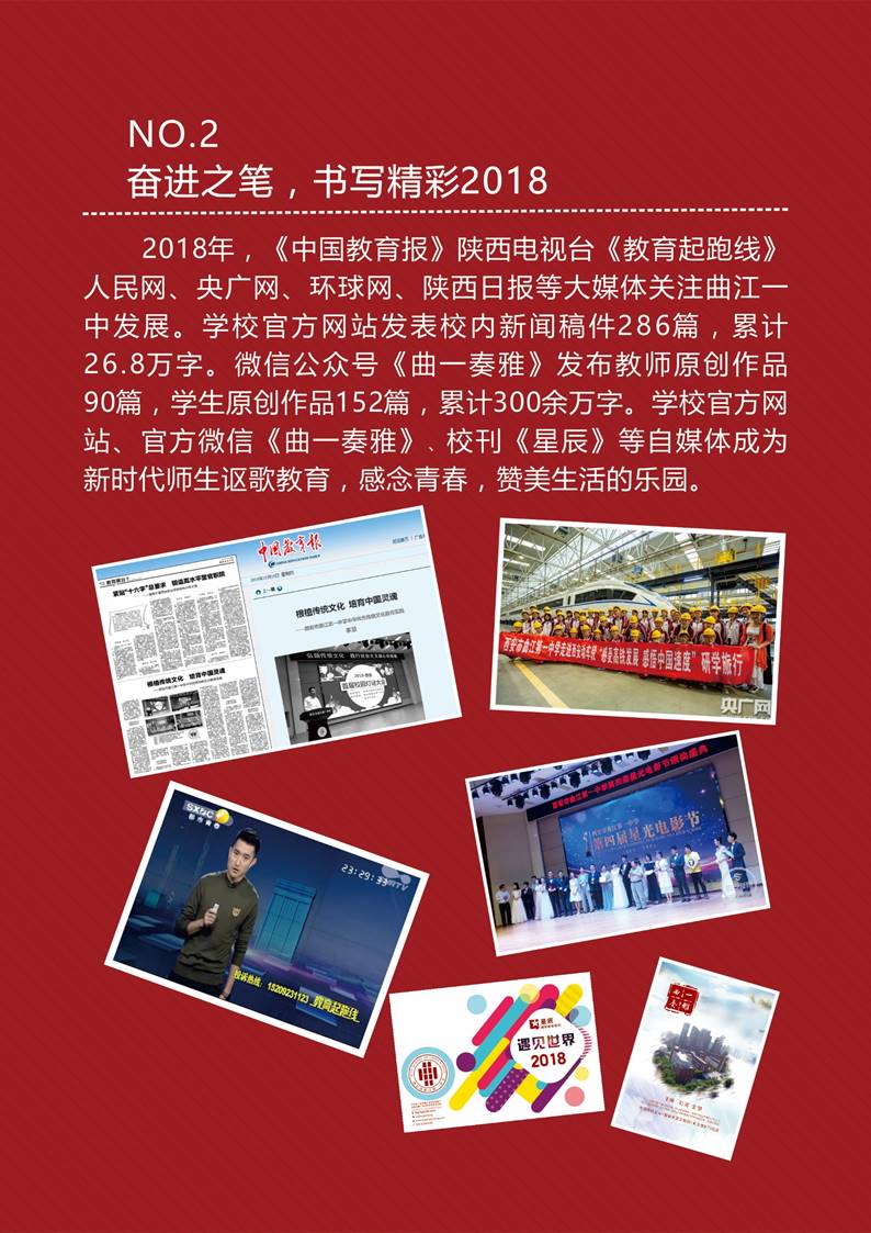 2018年,《中国教育报》陕西电视台《教育起跑线》人民网、央广网、环球网、陕西日报等大媒体关注曲江一中发展。学校官方网站发表校内新闻稿件286篇,累计26.8万字。微信公众号《曲一奏雅》发布教师原创作品90篇,学生原创作品152篇,累计300余万字。学校官方网站、官方微信《曲一奏雅》、校刊《星辰》等自媒体成为新时代师生讴歌教育,感念青春,赞美生活的乐园。