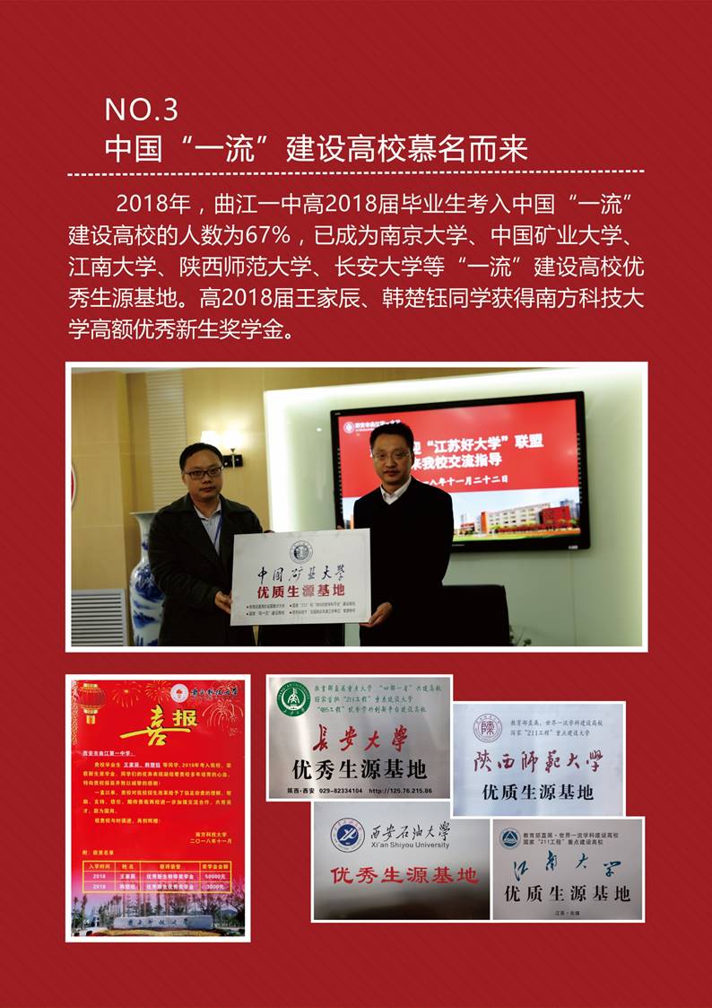 2018年,曲江一中高2018届毕业生考入中国“一流”建设高校的人数为67%,已成为南京大学、中国矿业大学、江南大学、陕西师范大学、长安大学等“一流”建设高校优秀生源基地。高2018届王家辰、韩楚钰同学获得南方科技大学高额优秀新生奖学金。