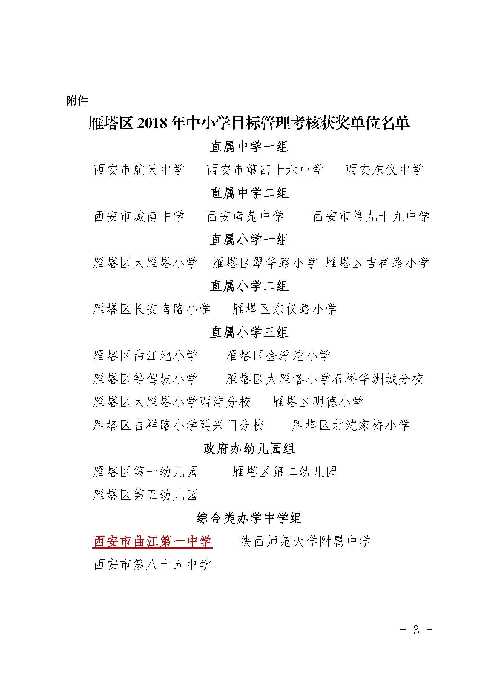 近日,从雁塔区教育局获悉,雁塔区2018年中小学校目标管理考核先进单位揭晓,西安市曲江第一中学荣获综合类办学中学组一等奖,特向全校教职工通报。
