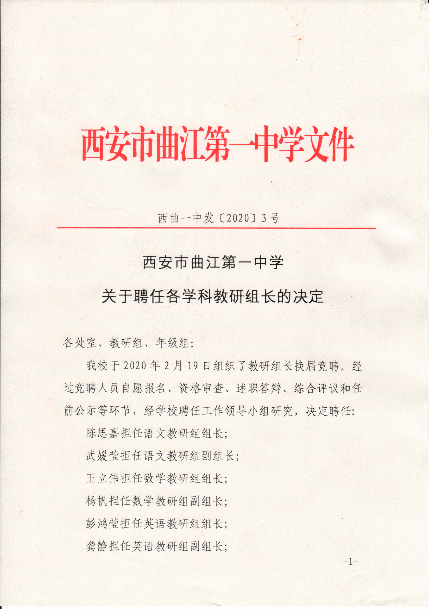 西安市曲江第一中学关于聘任各学科教研组长的决定