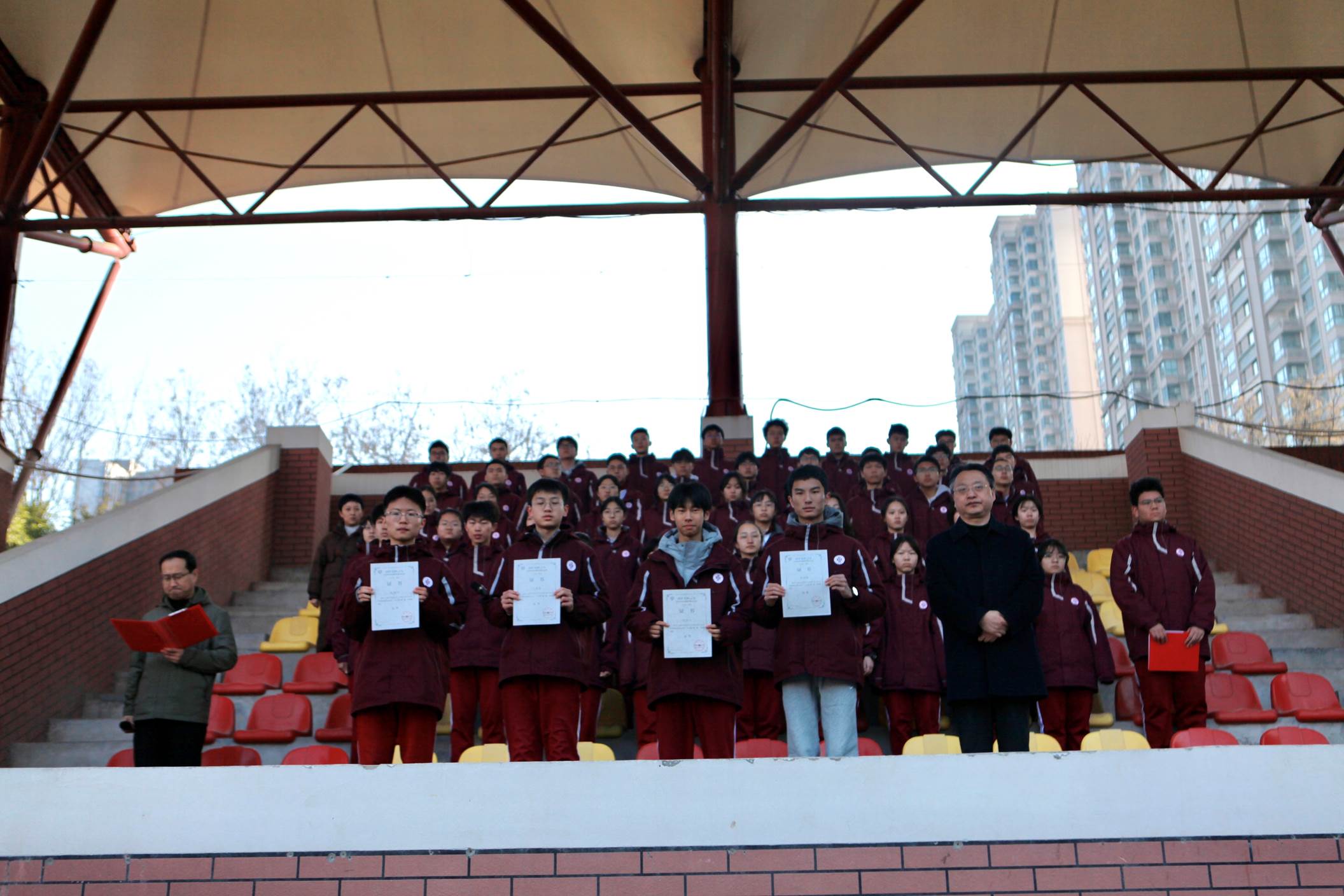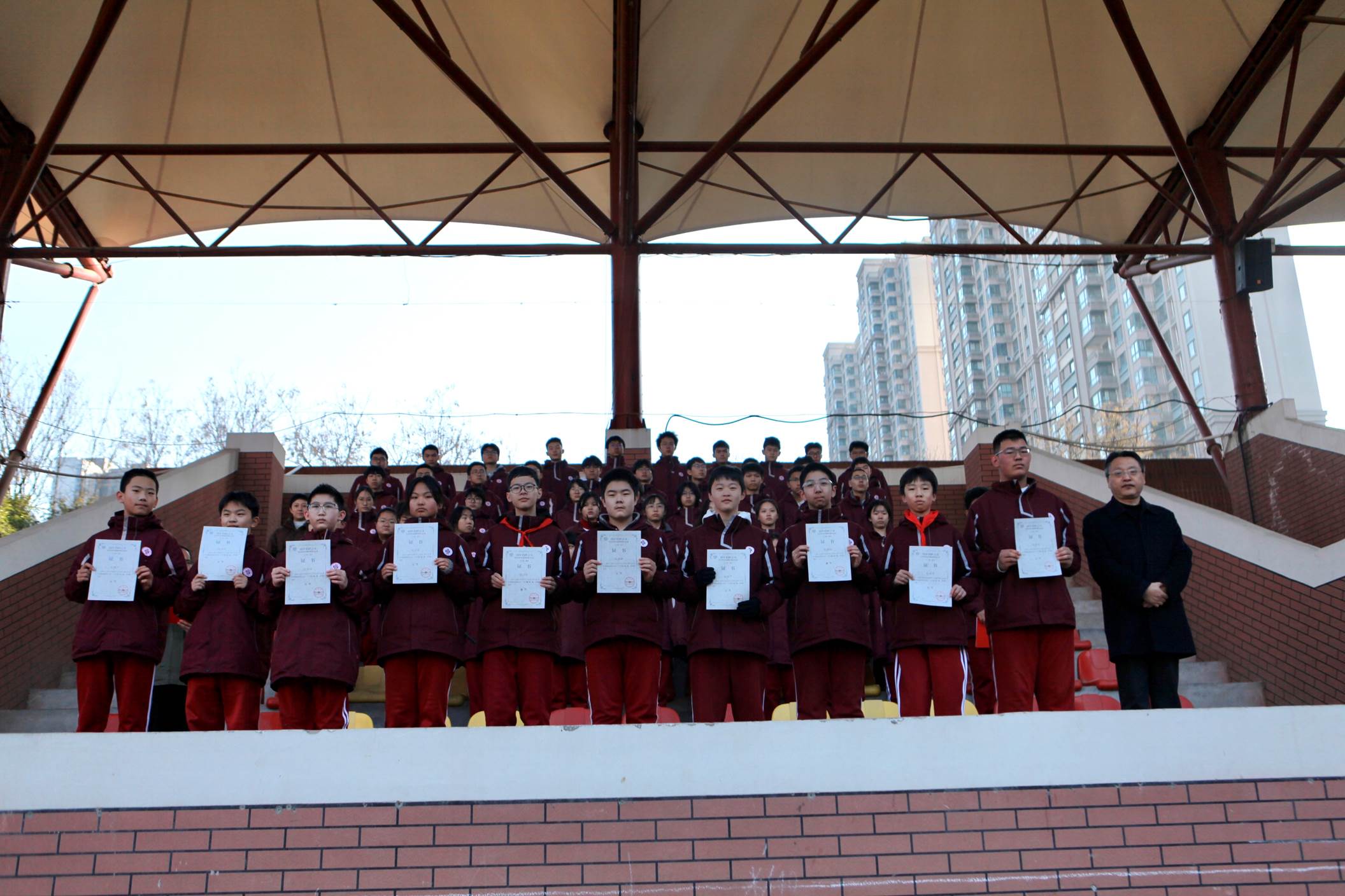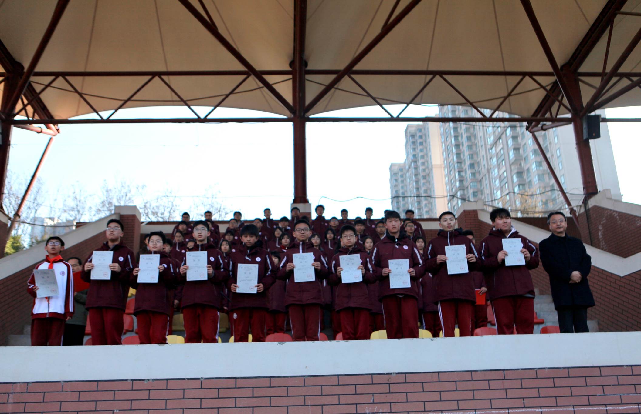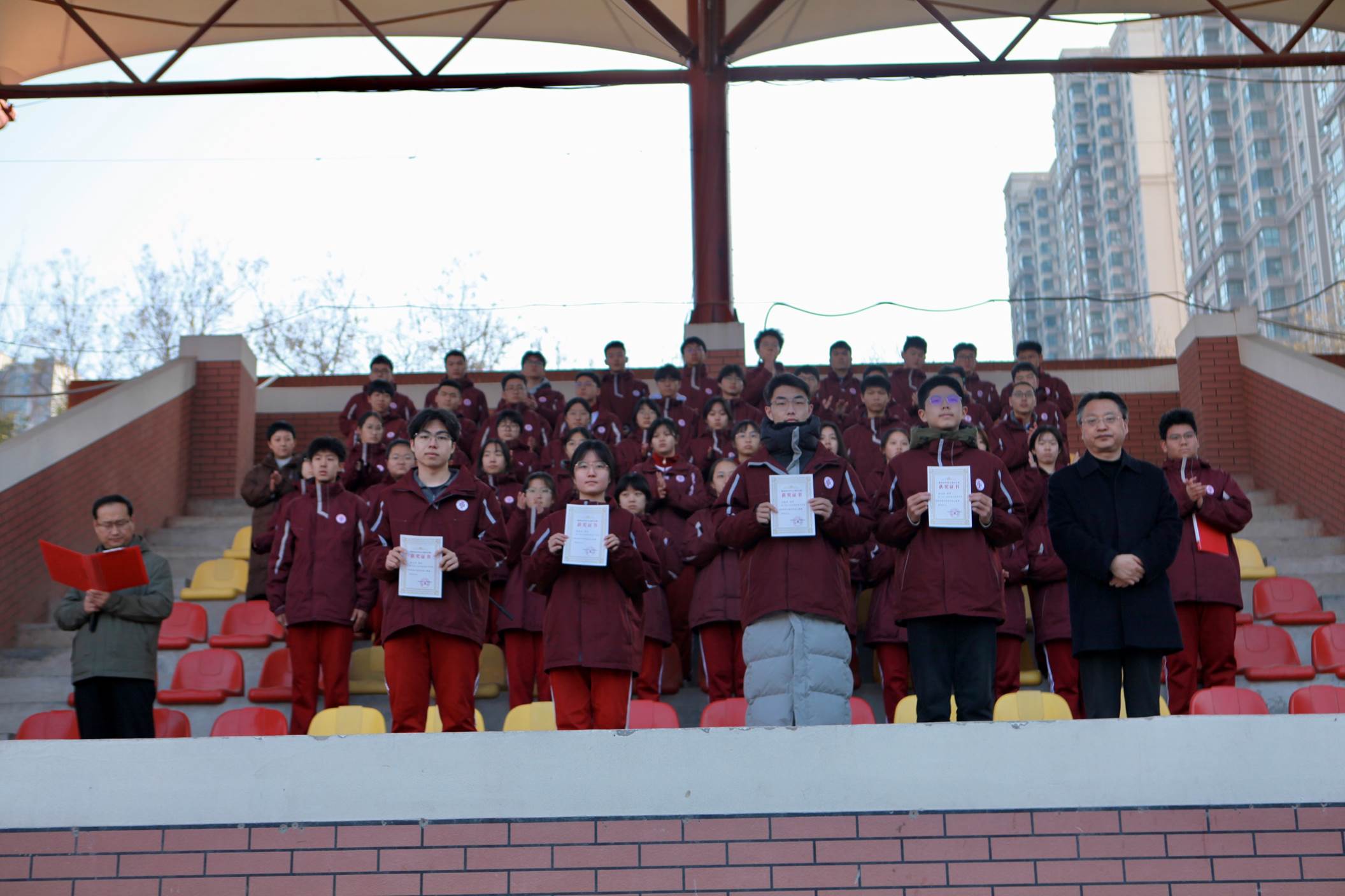 第三项,高2025级3班柴开源同学做一分钟英语演讲;第四项:宣读第20周获得“日常行为规范优秀班级”结果;第五项,宣读获奖消息,由校长陈勇刚为获奖学生颁发荣誉证书并合影留念。最后由高2025级1班吴亚楠、张云水同学领诵经典诵读文本《江城子·密州出猎》和曲江一中校训,嘹亮的诵读声响彻操场,豪迈的气势振奋人心。