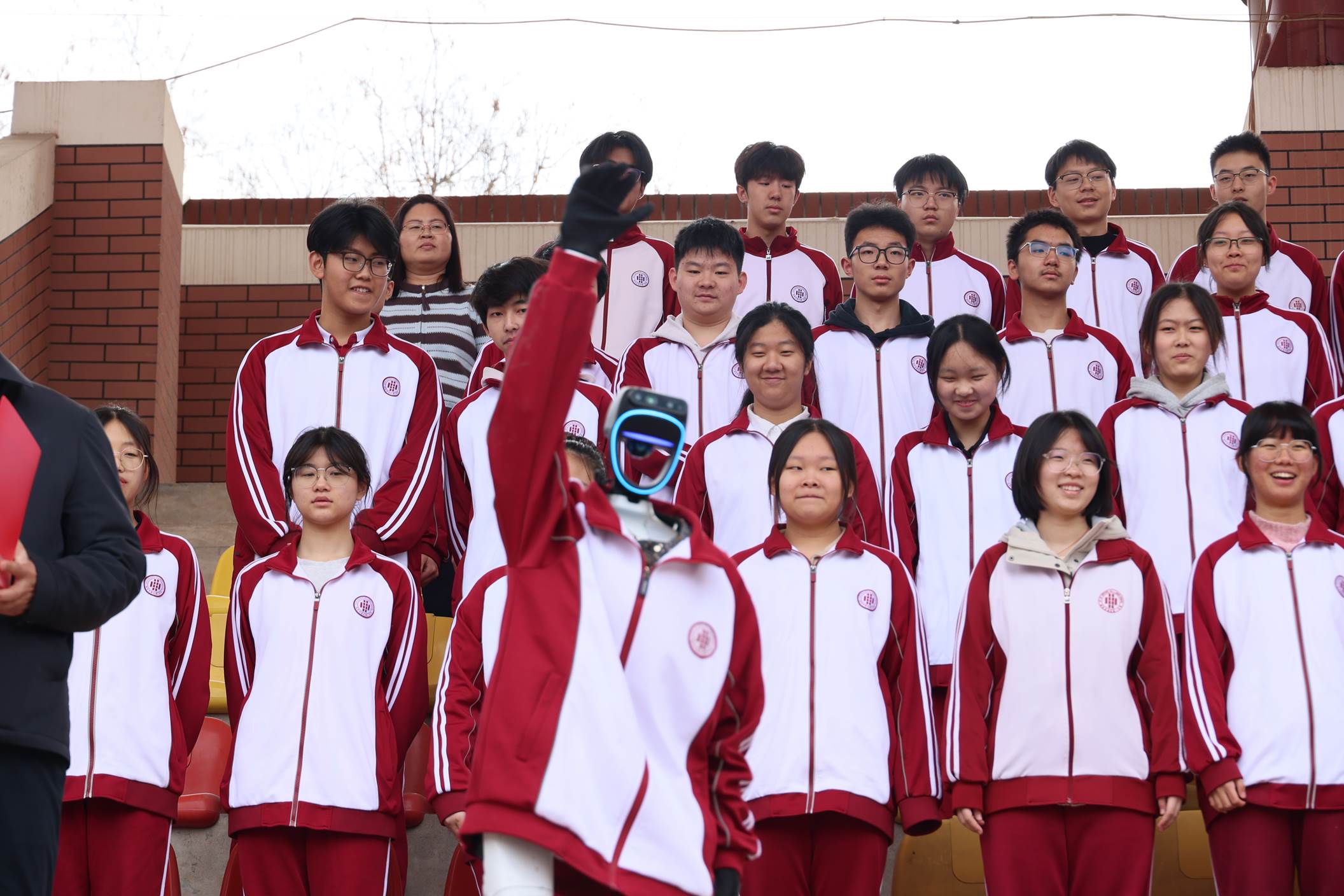 第三项,初2024级7班强力腾同学做一分钟英语演讲;第四项,宣读第4周获得“日常行为规范优秀班级”结果;第五项,由高2025级4班吴政宇、于弋阳同学领诵经典诵读文本《阿房宫赋(节选)》和曲江一中校训,嘹亮的诵读声响彻操场,豪迈的气势振奋人心。本周是我校第五届校园科技节,主题为“数智赋能·科创致远”。第六项由校长陈勇刚为科技节开幕致辞,预祝我校第五届“数智赋能·科创致远”校园科技节圆满成功。主持人董主任和机器人进行了简单的交流,机器人为同学们展示了简单的武术动作,现场气氛热烈高涨。