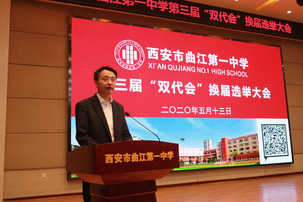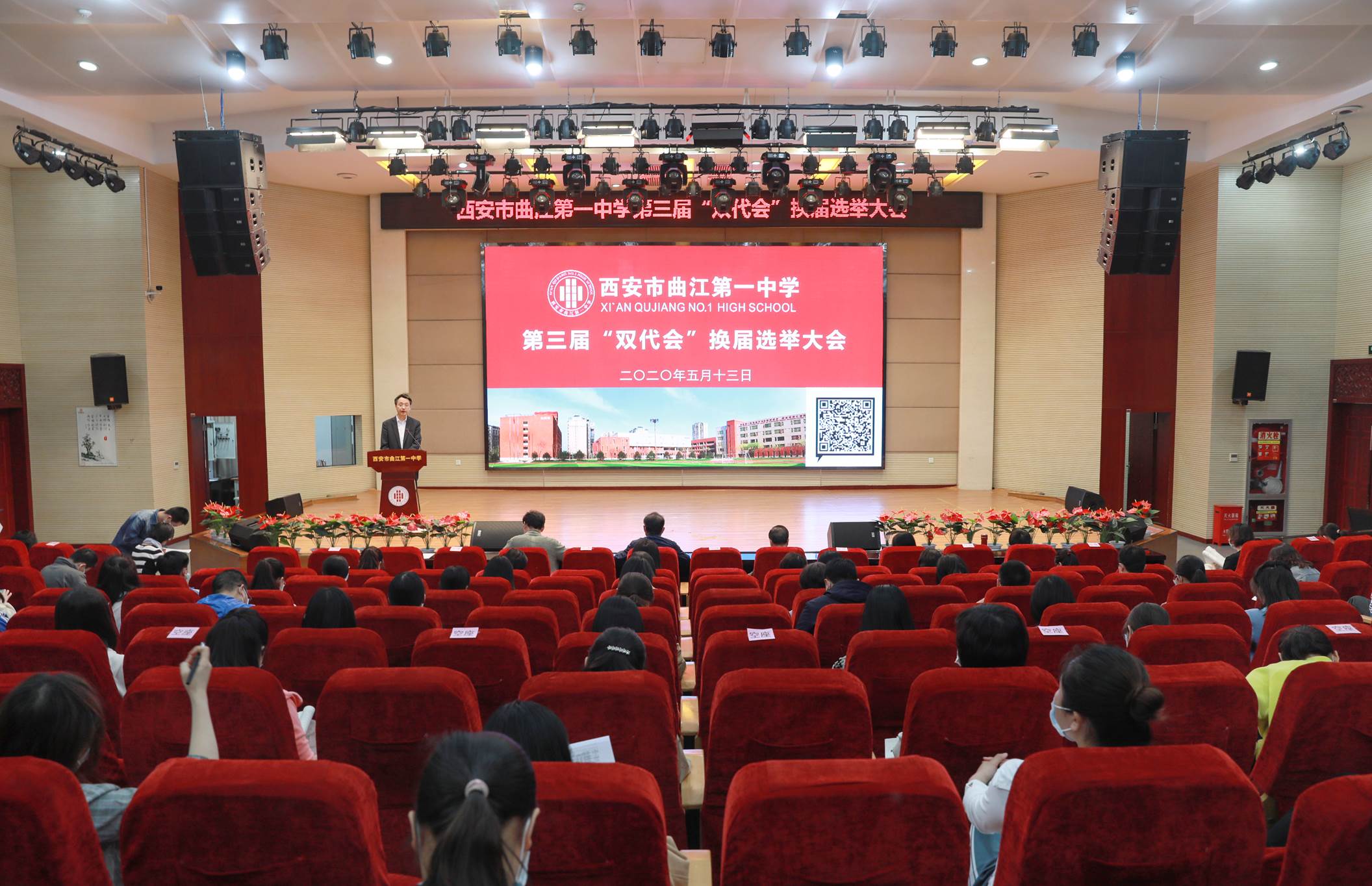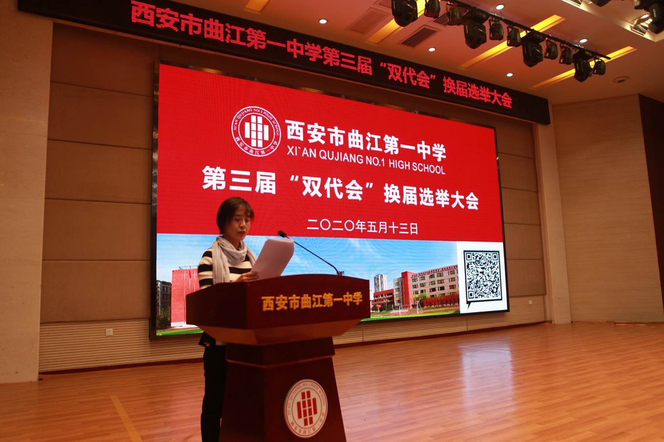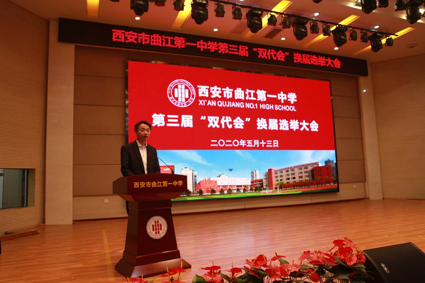 2020年5月13日,西安市曲江第一中学在润德厅隆重召开第三届“双代会”换届选举大会。常务副校长陈勇刚、副校长沙瑞龙及全体中层领导、全校教职工参加本次会议。常务副校长陈勇刚主持大会。根据疫情防控要求,全体参会人员均佩戴口罩,保持间隔落座,确保大会安全有序进行。