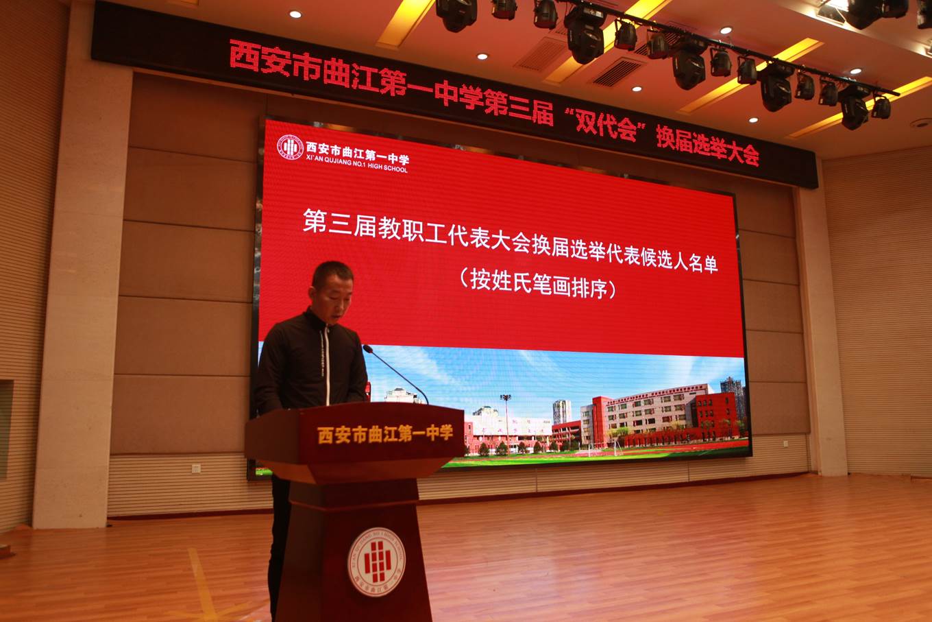随后,常务副校长陈勇刚宣读了《西安市曲江第一中学第三届“双代会”换届选举办法》,并强调换届工作的注意事项。根据选举办法规定,本次选举大会成立以边团结同志为主任、陈勇刚、沙瑞龙同志为副主任的工作委员会,工作委员会下设筹备小组,申小娟同志担任组长,在换届选举大会开幕后,筹备小组随之转为大会工作组。选举办法还对代表和委员当选条件、代表构成及名额分配、具体操作流程等做了详细要求。