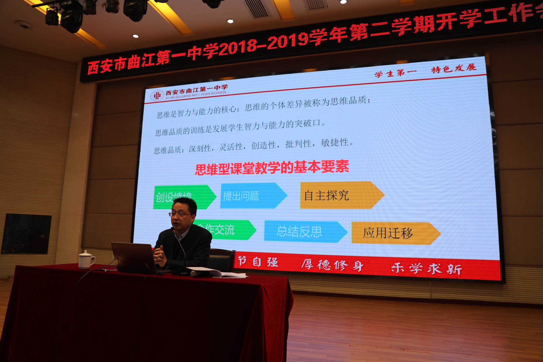常务副校长陈勇刚首先对“提升位次、强化特色、精细管理、内涵发展”的目标进行了阐述:“提升位次”就是要提升高考、中考位次,提升学校知名度和影响力,进而赢得更大的空间来发展学校的办学特色;“强化特色”就是要以学生第一,特色发展,做好思维型课堂教学,丰富校本课程体系;“精细管理”就是要加强学校管理、执行力,做好年级管理、班级管理、课堂管理;“内涵发展”就是要培养教师队伍,坚持立德树人,从物质、制度、精神和行为四个方面营造良好校园文化。随后,陈校长从全面加强学校党建工作、落实立德树人根本任务、全面提升教育教学质量、全力提高行政效能、全方位做好后勤保障工作等五个方面通报了本学期的重点工作。