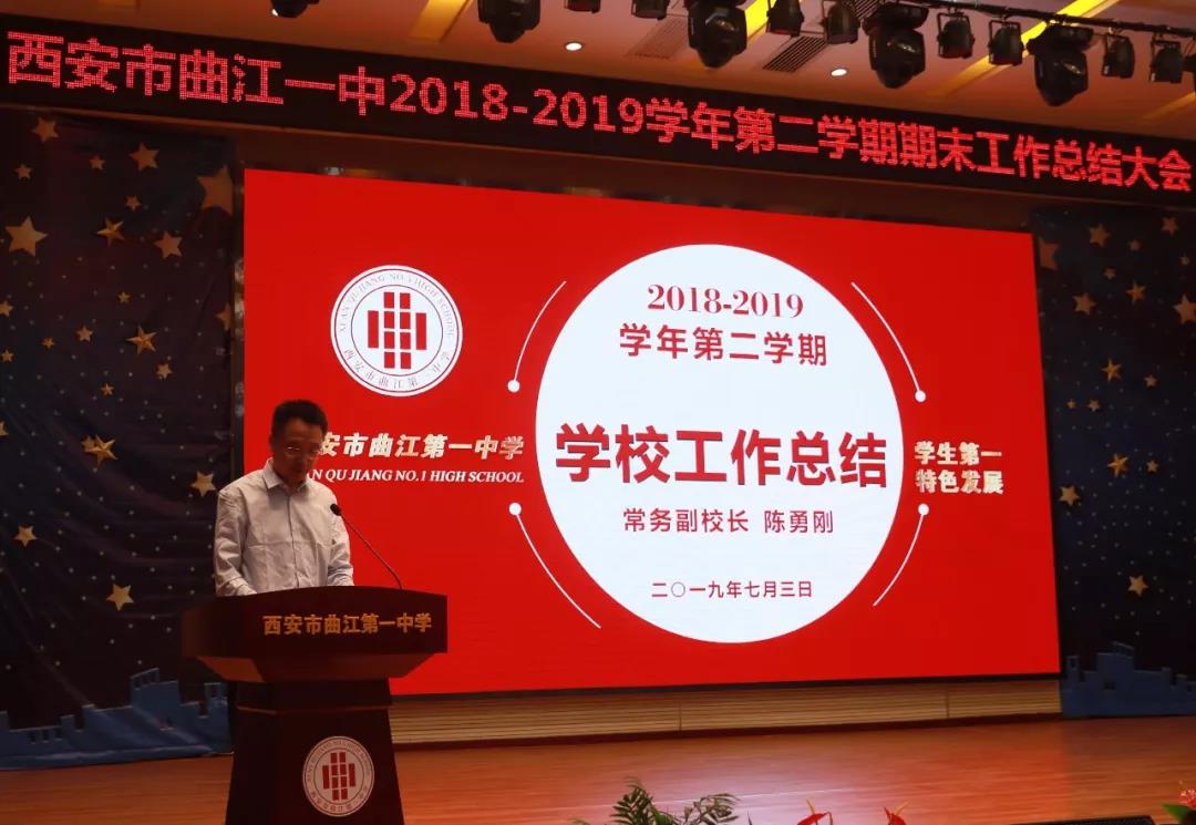 常务副校长陈勇刚主持会议。陈校长首先介绍了2019年新入职教师,随后从党建工作、教务处教研室工作、政教处团委工作、校办工作、总务处工作五个方面对本学期工作进行了总结,对高2019届、高2020届在高考和学考中取得的优异成绩表示祝贺,对老师们在各级各类比赛中的突出表现表示肯定,对一学期来辛勤付出的教职工表示衷心的感谢。陈校长指出,本学期我校继续秉承“学生第一 特色发展”的办学理念,坚持“根植传统育中国灵魂,面向国际聚世界眼光”的发展目标,开展了丰富多彩的校园文化活动。相继举办了“曲江流饮·春日诗会”、第五届星光电影节、曲一好声音、高三成人礼、百日誓师大会、初三毕业典礼、研究性学习汇报展演以及足球、篮球、排球等体育比赛,开设合唱、啦啦操、舞蹈等20余个学生社团,组织开展了与美国尤方玉萍学校的国际交流活动等,丰富的活动成为学生展现风采的舞台,拓宽了学生的国际视野,培养了学生的核心素养,为学生终身发展奠定了坚实基础。