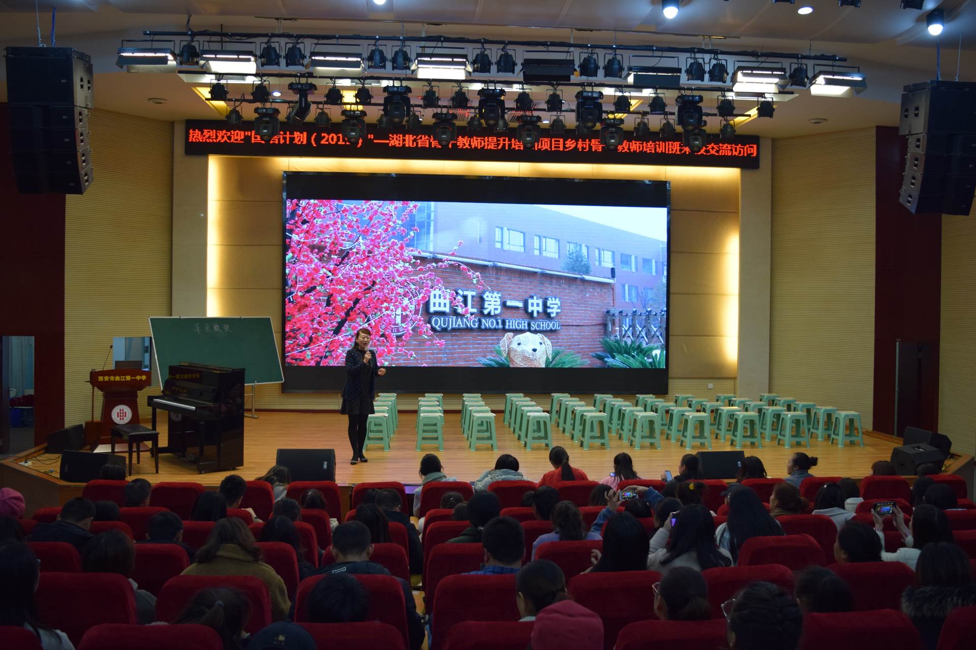 2019年11月20日下午,国培计划(2019)-湖北省骨干教师提升培训项目乡村骨干教师一行90余人到曲江一中访问交流。校办主任申小娟、艺术教研组组长黄晨老师在润德厅热情接待来访人员。