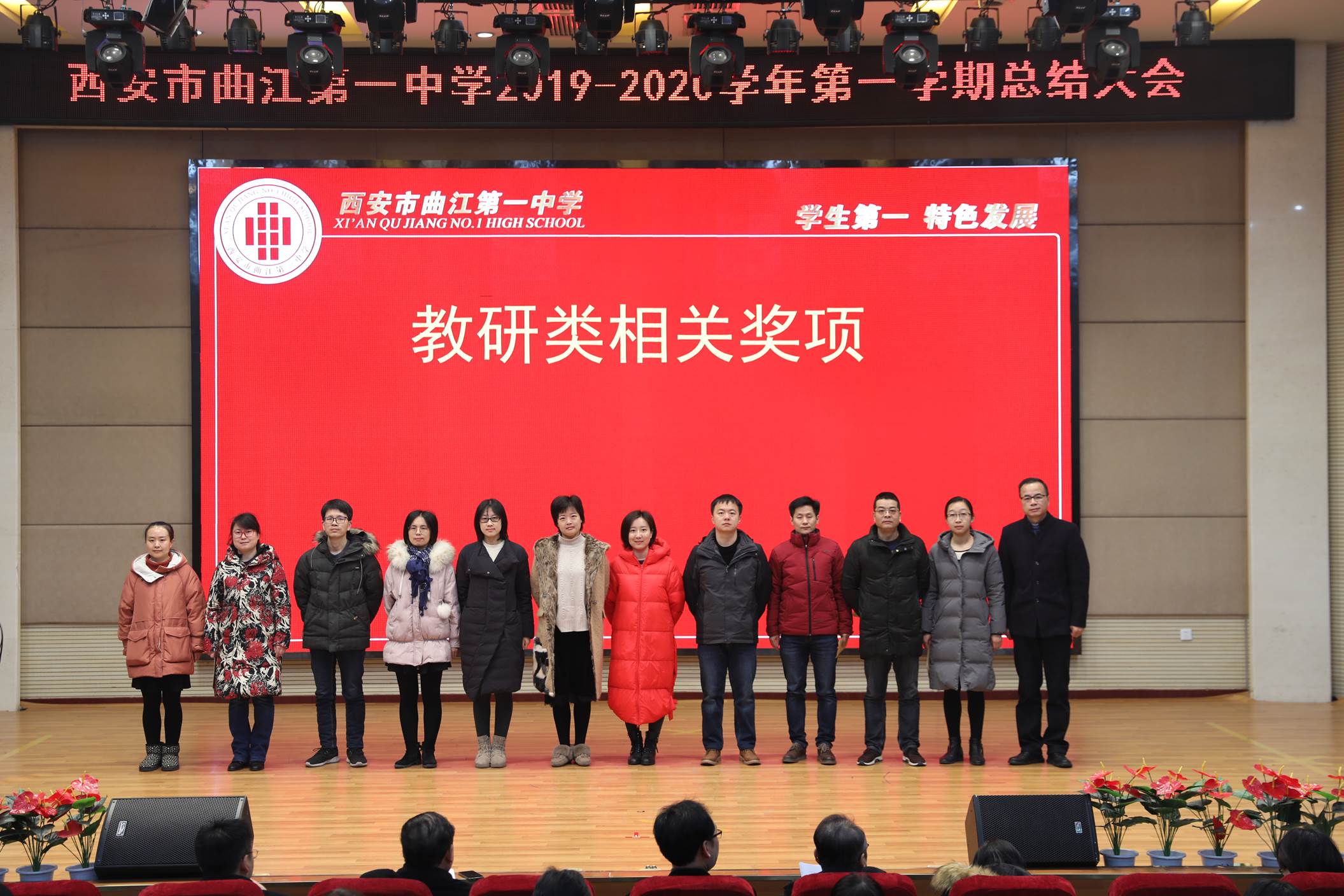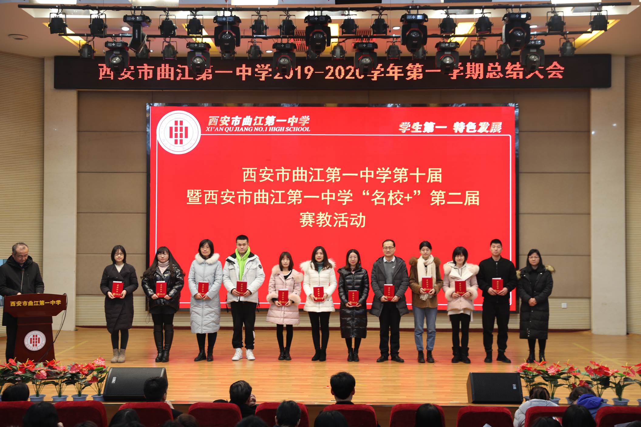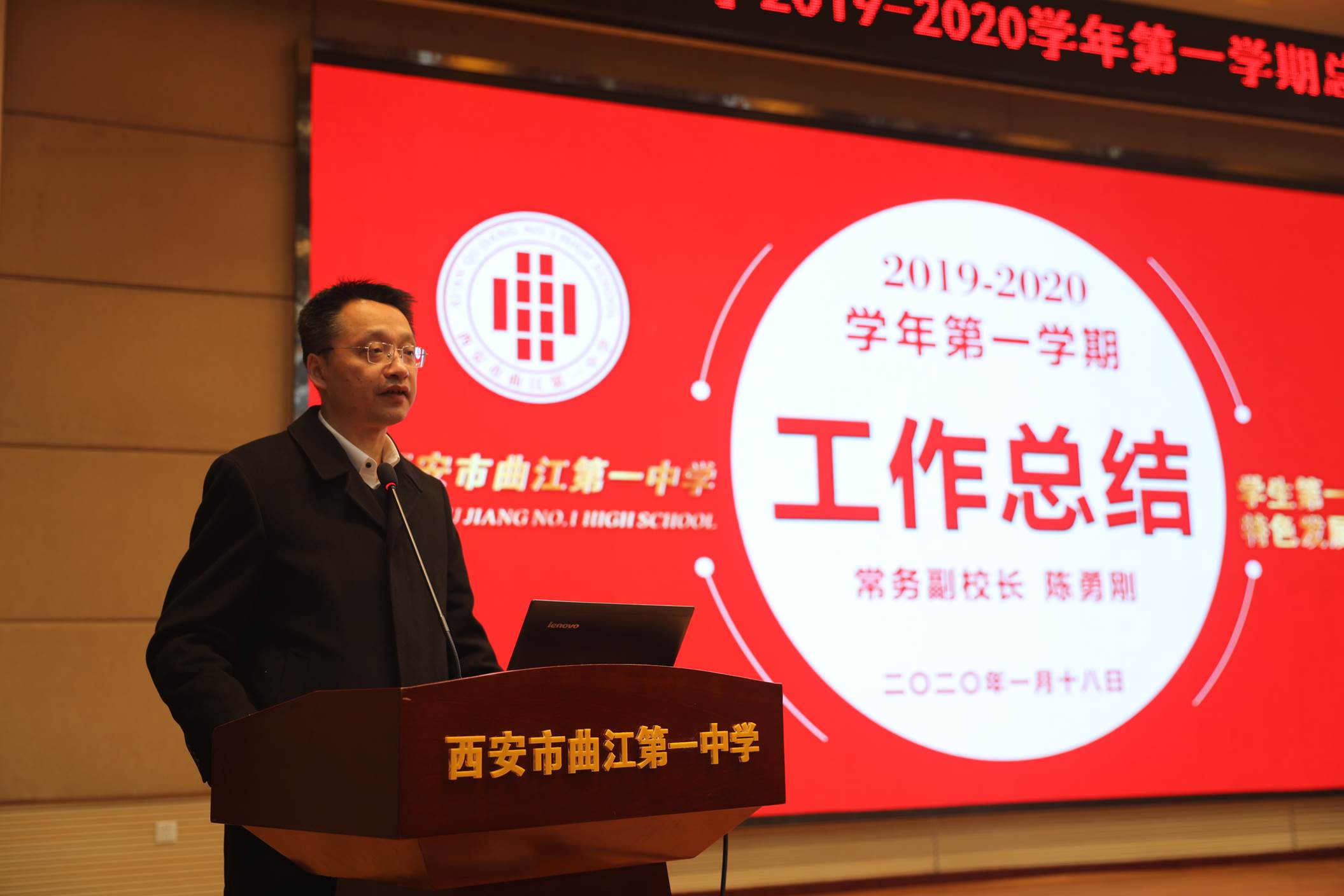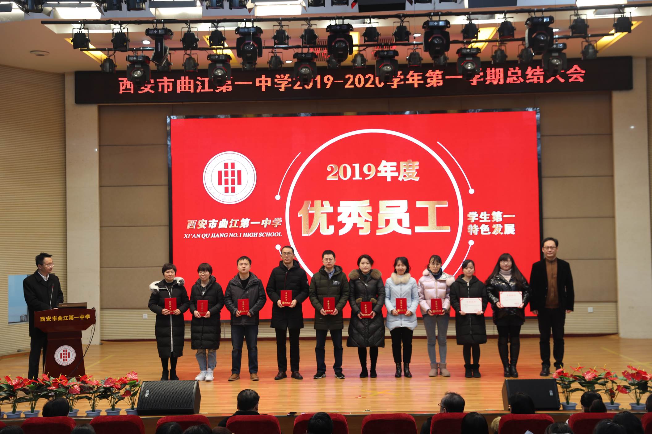 会议由校长边团结主持。会议第一项,常务副校长陈勇刚就本学期的德育、教学教研、行政和后勤等工作,按照月份做了总结,肯定了全体教职工在过去一学期的辛勤努力。会议第二项,常务副校长陈勇刚宣读了西安市曲江第一中学关于表彰2019年优秀教职工的决定,白国强、崔敏、蔡立翔等63位老师荣获2019年度述职考核优秀教职工称号,校长边团结、常务副校长陈勇刚、副校长沙瑞龙为年度优秀教职工颁发了荣誉证书;会议第三项,教务处主任刘公潜、教研室主任罗红梅分别宣读了第十届赛教比赛结果及本学期在国内外期刊上发表论文、国家省市区各类论文评比、市区小课题中获得各奖项的教师名单,各部门主任分别为老师们颁发了奖励。会议第四项,副校长沙瑞龙介绍学校落实西安市教育局下发的关于“万名教师大家访”活动的相关安排。