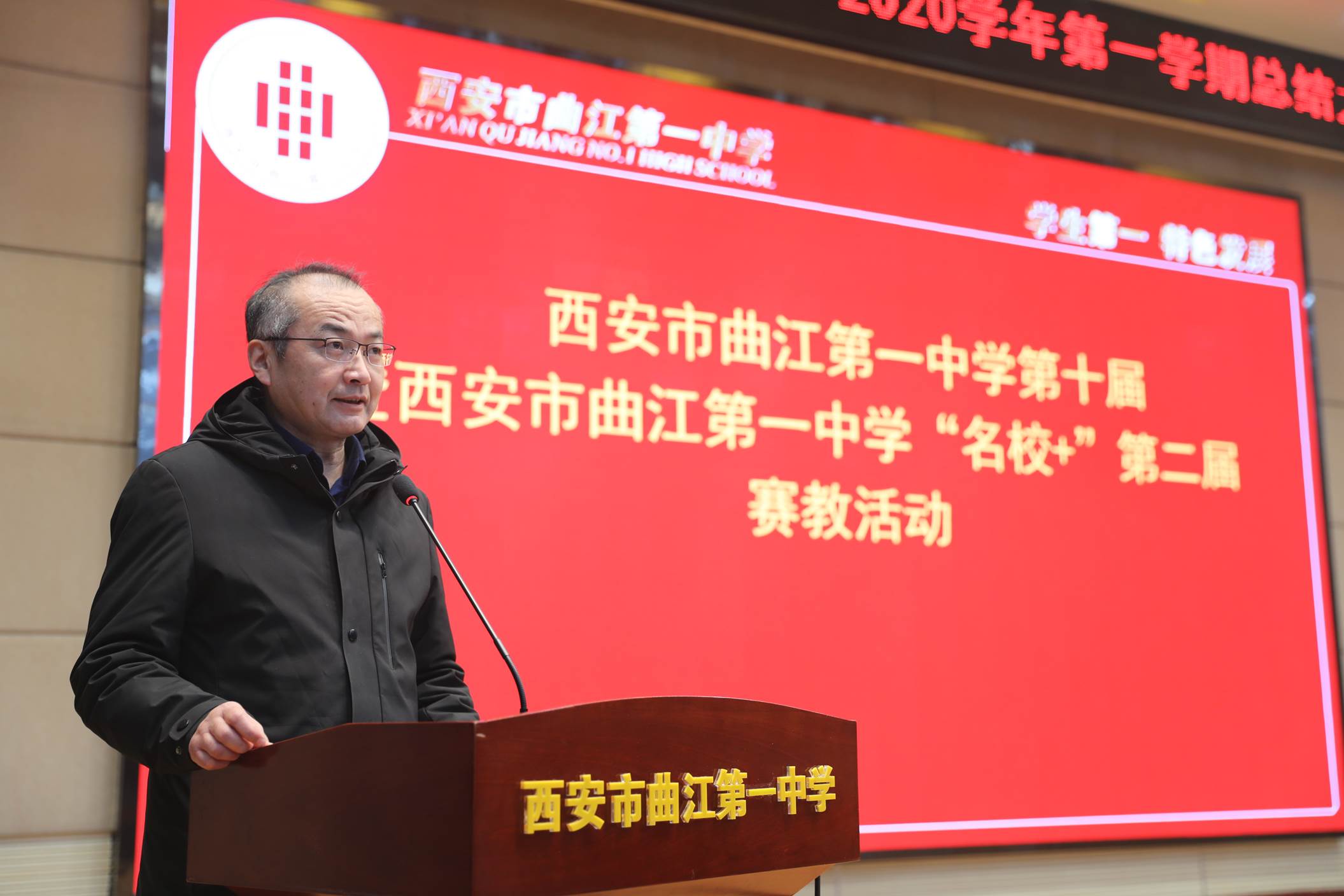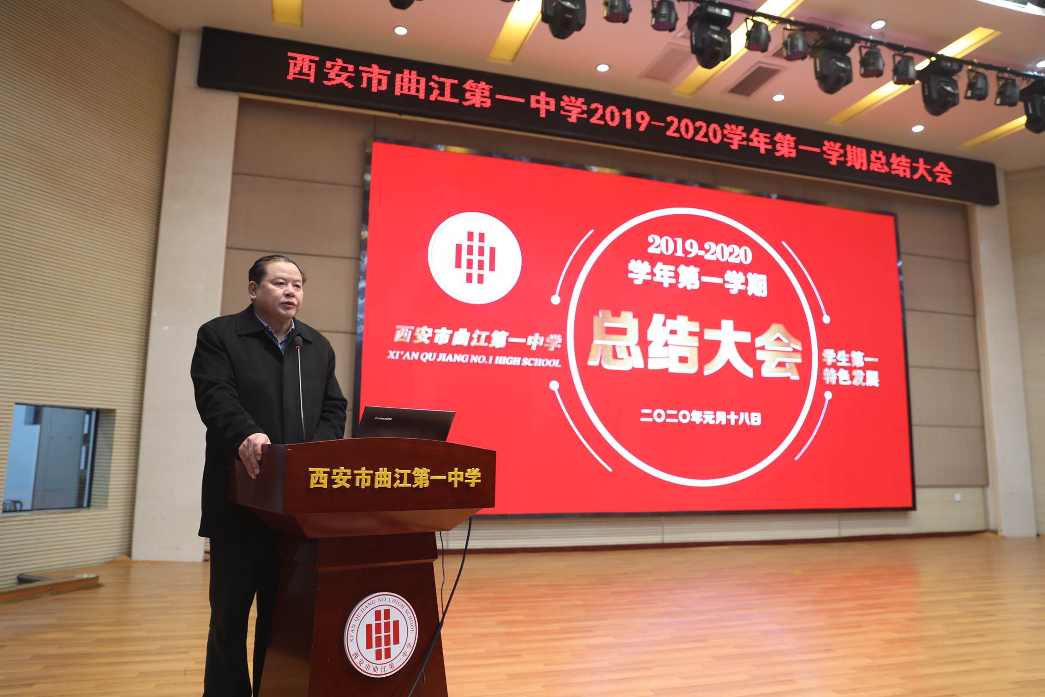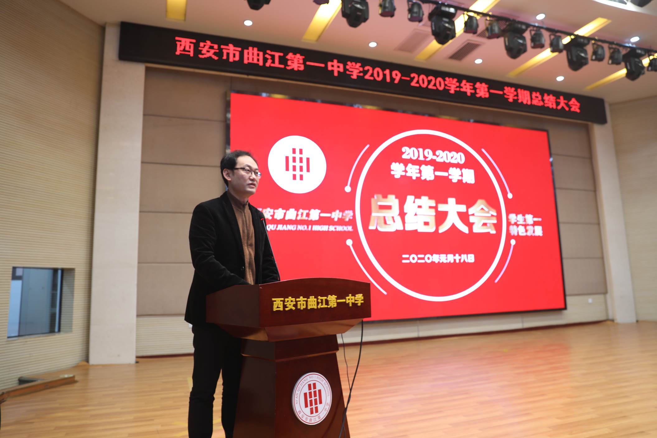 会议由校长边团结主持。会议第一项,常务副校长陈勇刚就本学期的德育、教学教研、行政和后勤等工作,按照月份做了总结,肯定了全体教职工在过去一学期的辛勤努力。会议第二项,常务副校长陈勇刚宣读了西安市曲江第一中学关于表彰2019年优秀教职工的决定,白国强、崔敏、蔡立翔等63位老师荣获2019年度述职考核优秀教职工称号,校长边团结、常务副校长陈勇刚、副校长沙瑞龙为年度优秀教职工颁发了荣誉证书;会议第三项,教务处主任刘公潜、教研室主任罗红梅分别宣读了第十届赛教比赛结果及本学期在国内外期刊上发表论文、国家省市区各类论文评比、市区小课题中获得各奖项的教师名单,各部门主任分别为老师们颁发了奖励。会议第四项,副校长沙瑞龙介绍学校落实西安市教育局下发的关于“万名教师大家访”活动的相关安排。