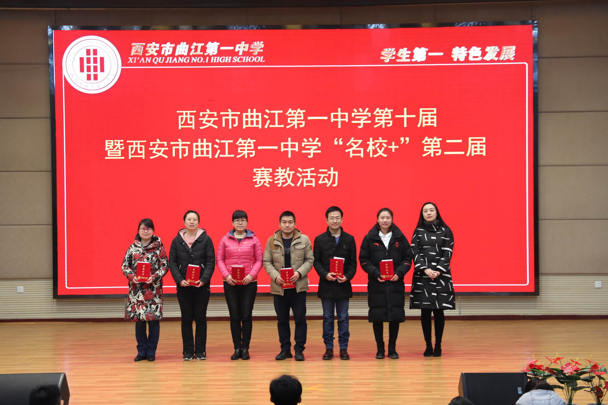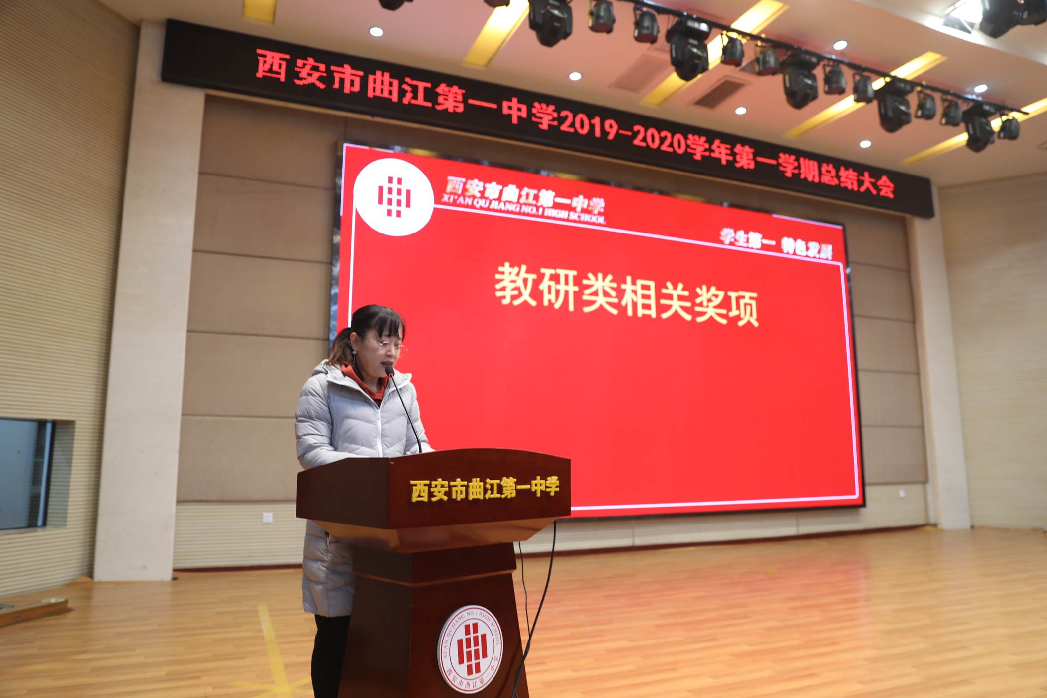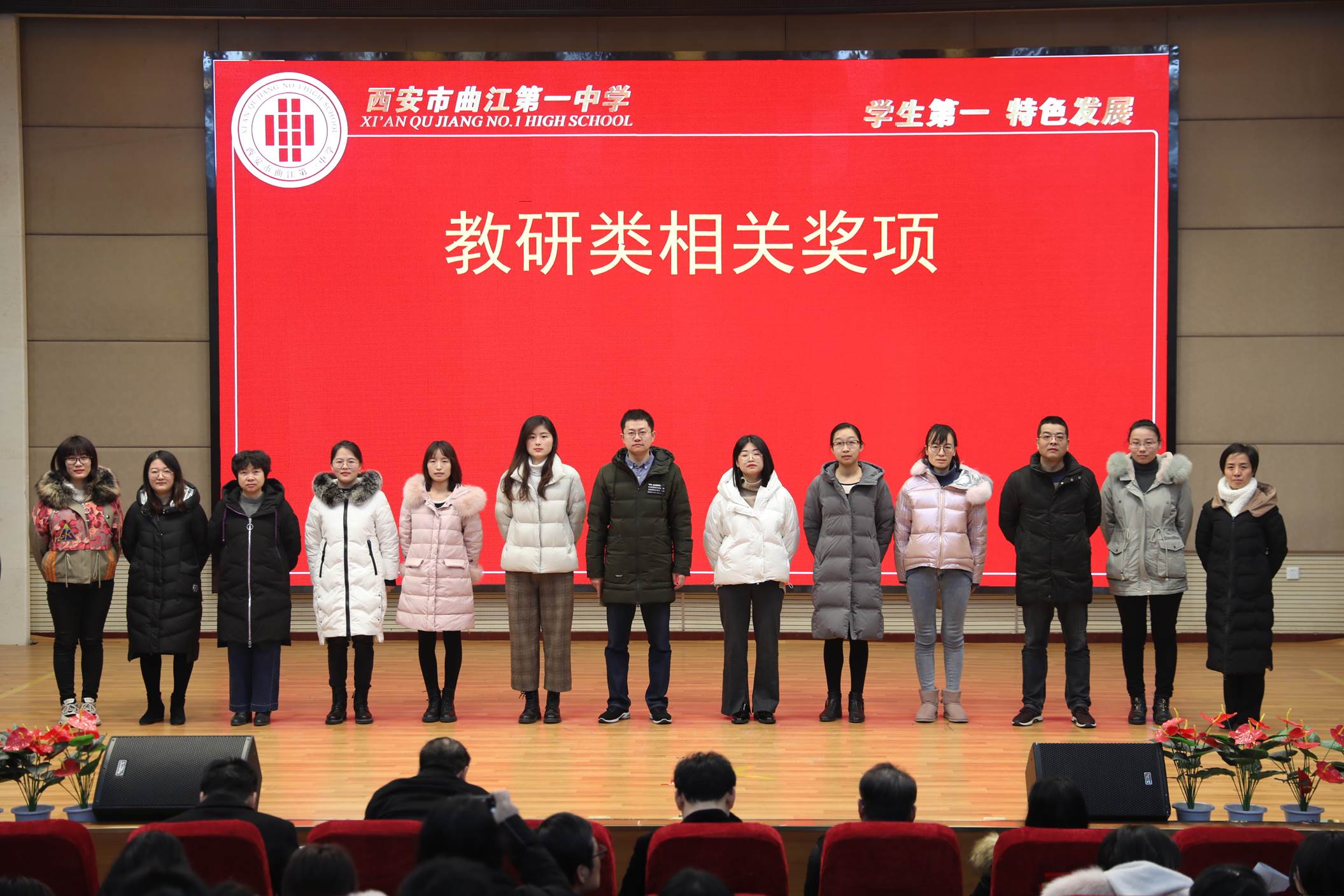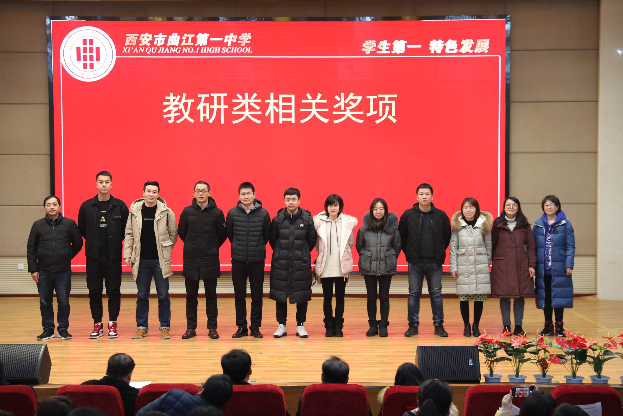会议由校长边团结主持。会议第一项,常务副校长陈勇刚就本学期的德育、教学教研、行政和后勤等工作,按照月份做了总结,肯定了全体教职工在过去一学期的辛勤努力。会议第二项,常务副校长陈勇刚宣读了西安市曲江第一中学关于表彰2019年优秀教职工的决定,白国强、崔敏、蔡立翔等63位老师荣获2019年度述职考核优秀教职工称号,校长边团结、常务副校长陈勇刚、副校长沙瑞龙为年度优秀教职工颁发了荣誉证书;会议第三项,教务处主任刘公潜、教研室主任罗红梅分别宣读了第十届赛教比赛结果及本学期在国内外期刊上发表论文、国家省市区各类论文评比、市区小课题中获得各奖项的教师名单,各部门主任分别为老师们颁发了奖励。会议第四项,副校长沙瑞龙介绍学校落实西安市教育局下发的关于“万名教师大家访”活动的相关安排。