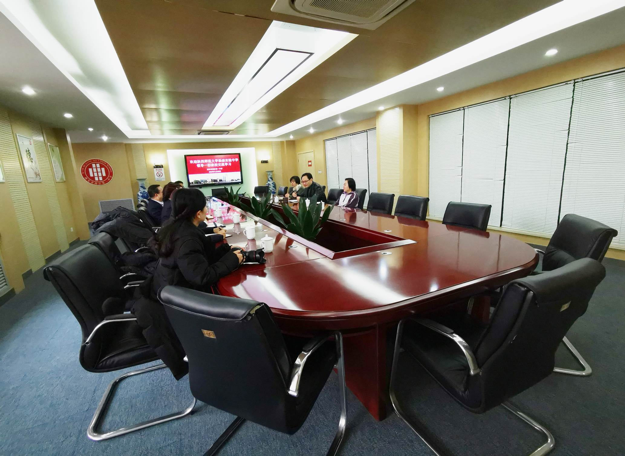 2019年11月22日上午9时, 陕西师范大学杨凌实验中学校长宋建社一行8人来访我校考察交流。副校长沙瑞龙在二楼行政会议室接待了宋校长一行,校办主任申小娟、总务主任王锦一同出席会议。