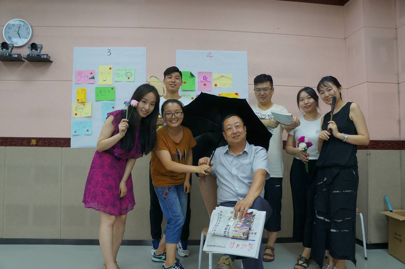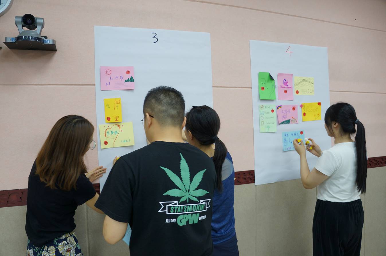 主题活动:在该环节中,岑老师设计了三个不同的团队活动让老师们之间更加地熟悉,发挥自己的创意,学会资源共享,并对未来的工作和生活进行了别具风格的展望。“集体创作”活动通过给定的七种道具,让小组成员发挥自己的想象力与创造力,编织小组的故事,展示小组独有的风采;“资源共享”活动不仅需要老师们小组内通力合作,更需要各组之间可以互通有无,互帮互助,达到在合作中竞争,在竞争中合作的良性沟通效果;“画向未来”活动更是设计巧妙,老师们不仅要为自己的未来做出规划,而且要在换位思考和揣摩他人心理的基础上,加入自己的思考与创新设计,为小组成员的未来做规划。通过活动分享环节,老师们的触动非常大,不仅让老师们的心灵彼此更近,而且让许多老师收获了惊喜。