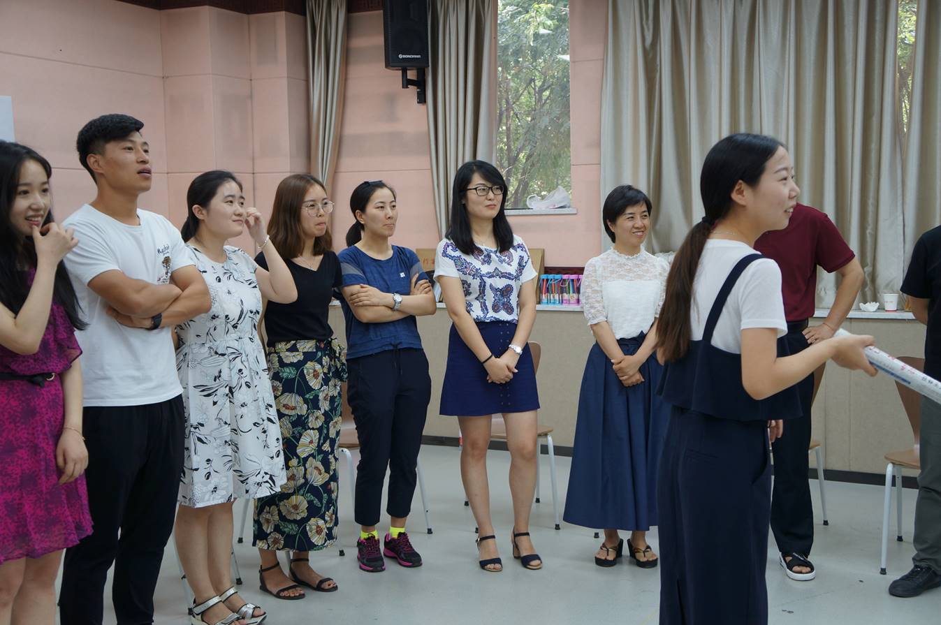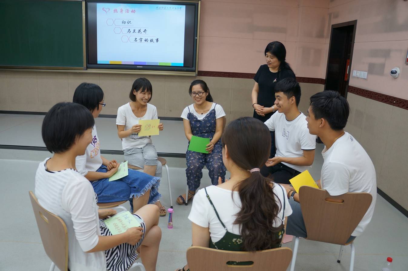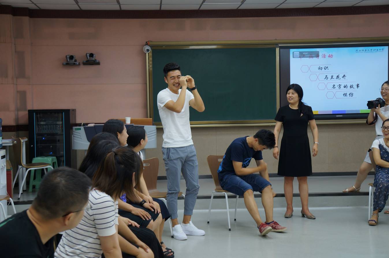 热身活动:记住别人的名字是尊重他人的表现,也是建立良好人际关系的第一步。为了让彼此陌生的新老师能够相互认识和熟悉,岑老师设置了初识、马兰花开、名字的故事、滚雪球、模仿、不打不相识等一系列活动,让老师们在短短的一个多小时里就轻松地记住了每一个人的名字,为后续主题活动中的团队创新与协作奠定了基础。