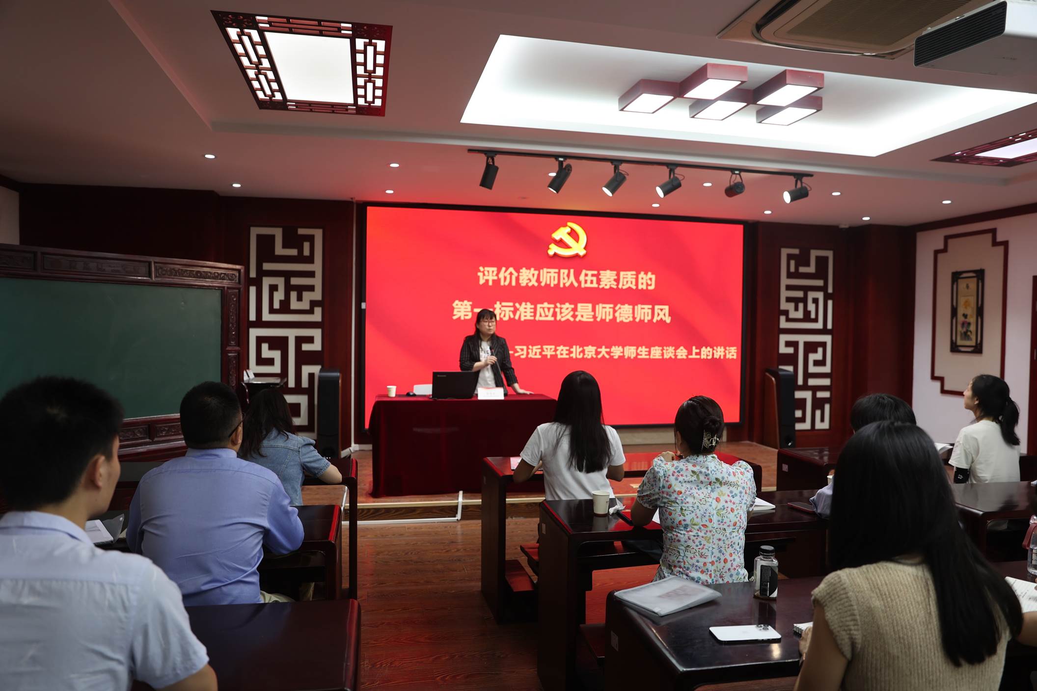 办公室副主任金凤玉就师德师风建设及考核办法、教职工着装及仪容仪表规范进行专题培训。金老师以自身从教的工作经历举例说明,要求大家熟知《新时代中小学教师职业行为十项准则》,做到规范从教行为,潜心教书育人。