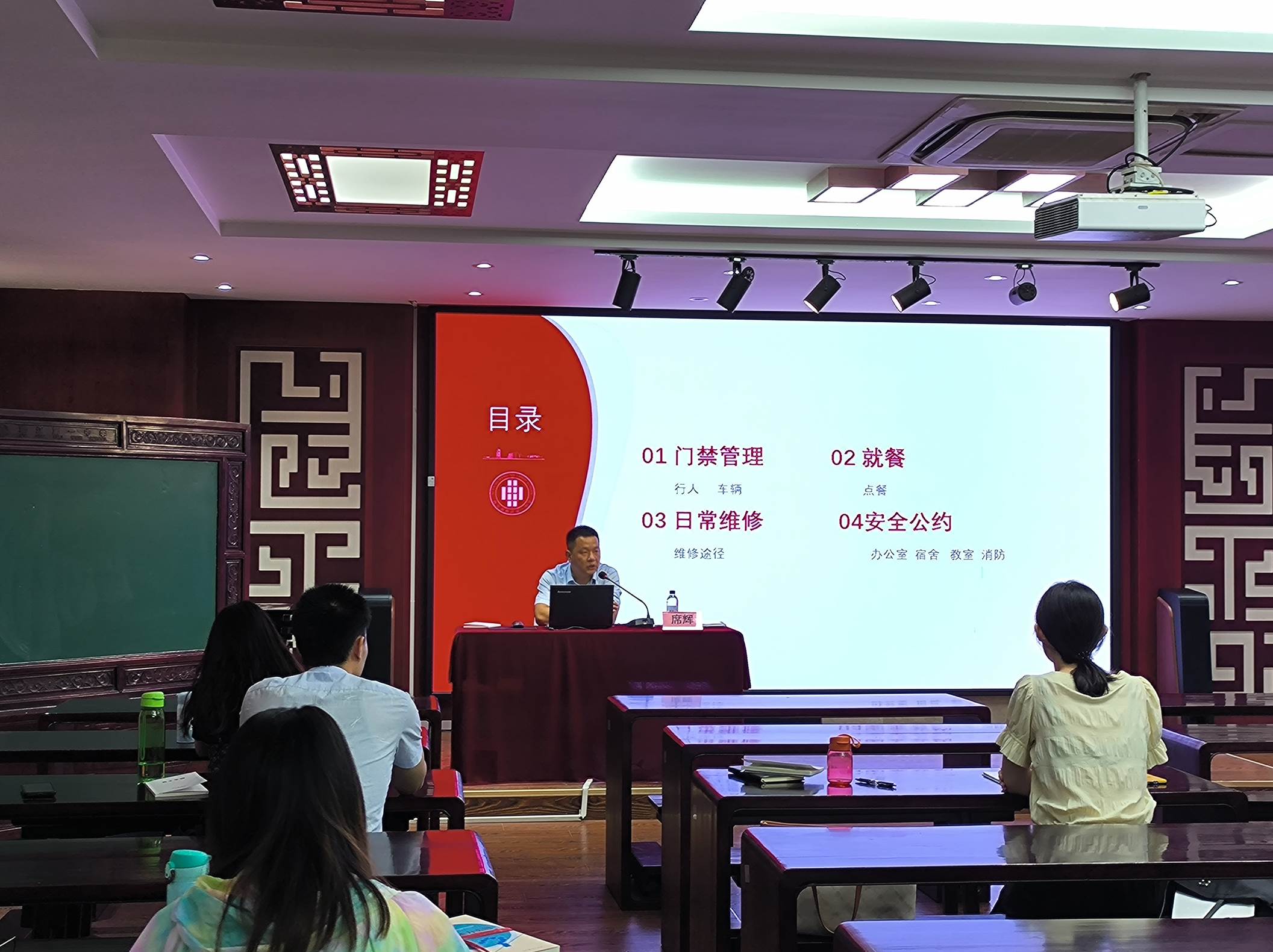 7月4日,总务处主任王锦对学校的安全基本情况进行了介绍,随后就固定资产损坏丢失经济赔偿、垃圾分类、物品采购、办公(生活)用品领用、日常维修范围及报修程序要求、维修费结算等物业管理方面的内容一一进行细致说明。