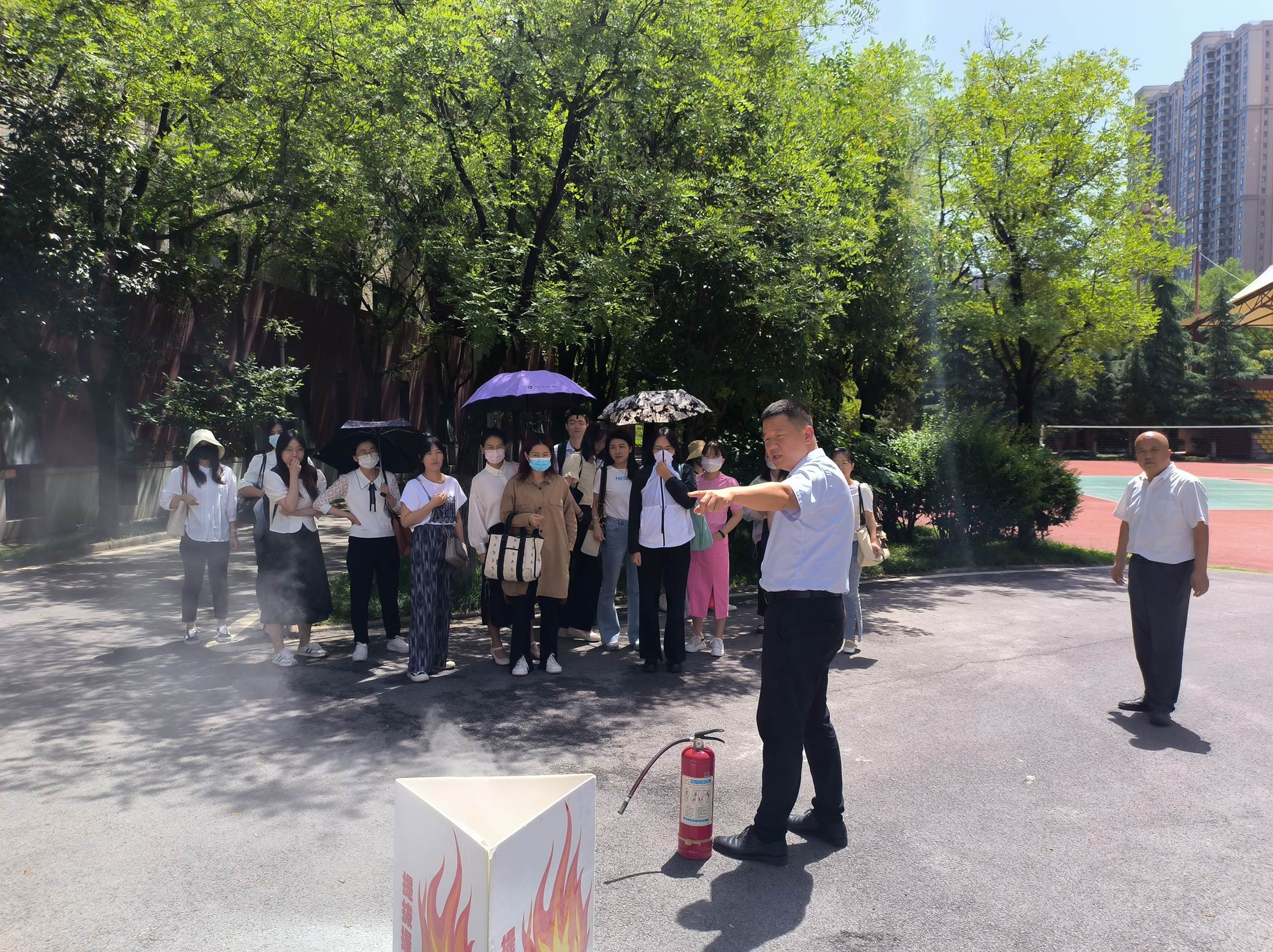 随后总务处副主任席辉对餐厅、停车、饮用水、公务用车使用进行讲解,强调办公室、宿舍、场馆等的消防安全和注意事项,现场讲解了灭火器和消火栓的使用方法并就地开展实操演练,牢固树立安全第一的理念。