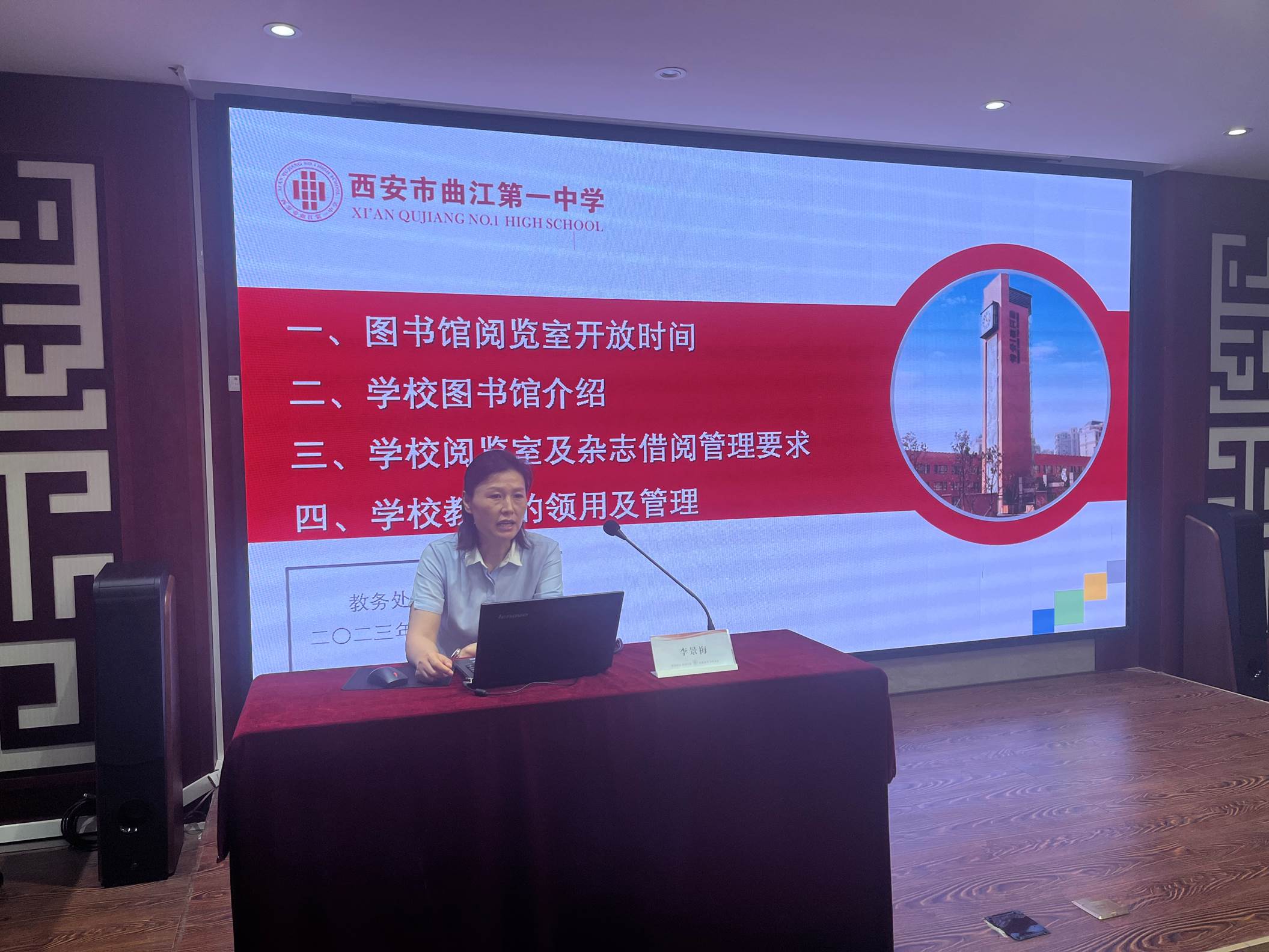 实验员吕倩老师从实验教学管理、实验室安全管理、卫生管理及学生实验守则、录课教室、国学教室的预约方式及使用方法进行了介绍。图书管理员李景梅老师对学校图书馆、阅览室书籍、杂志借阅管理要求及学校教材领用要求进行了说明。