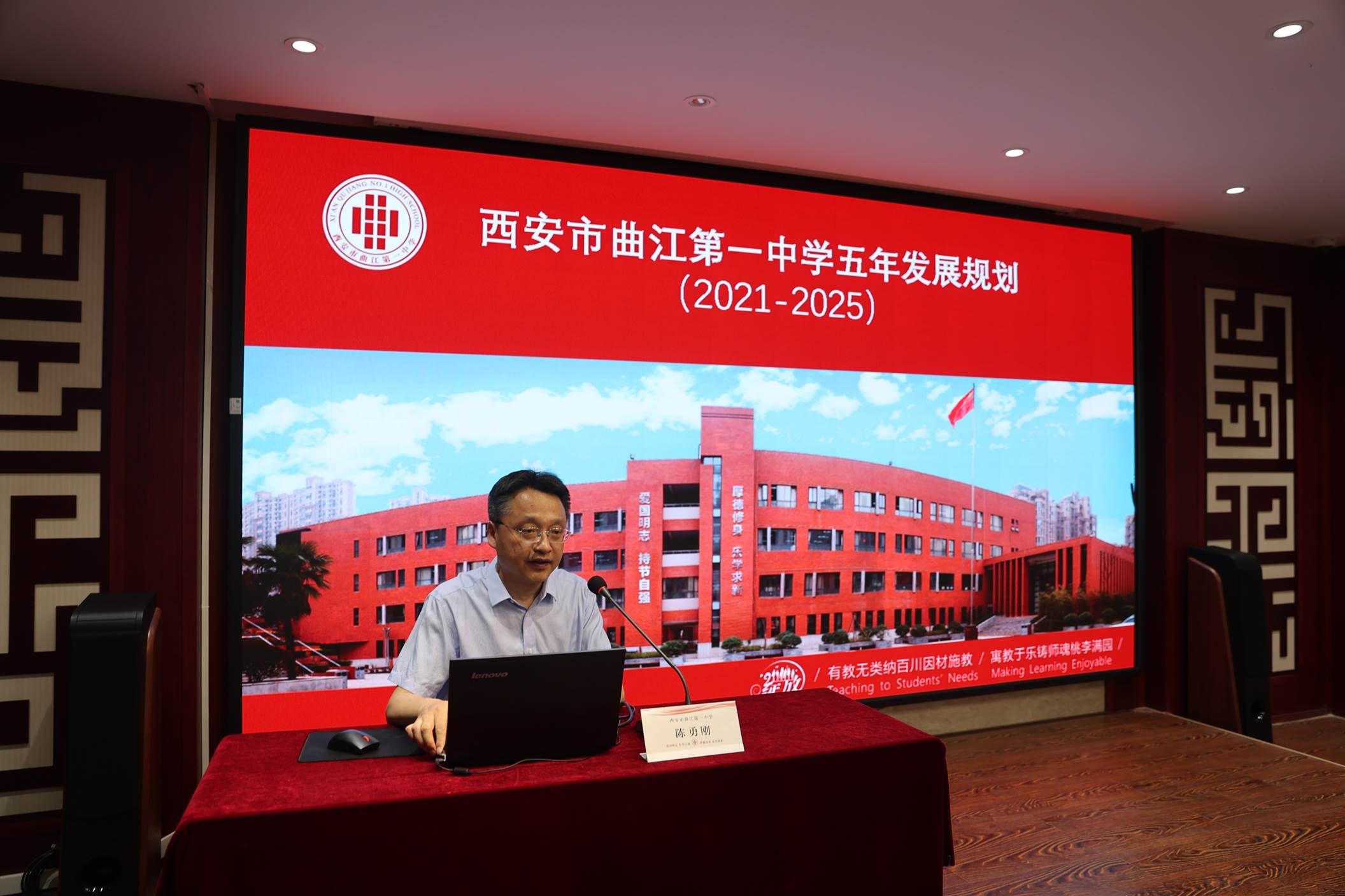 曲江一中校长陈勇刚通过《西安市曲江第一中学五年发展规划(2021-2015)》向与会人员详细介绍了学校的基本情况、办学绩效、指导思想和主要目标、主要任务、保障措施以及发展面临的机遇与挑战。