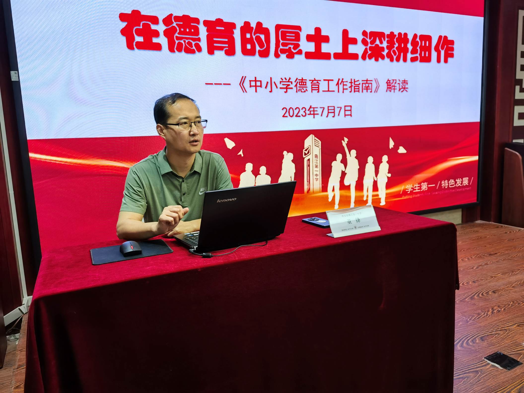 7月7日上午,政教处副主任董锋在国学教室为新入职教师解读《中小学德育工作指南》。董主任从什么是德育、《中小学德育工作指南》的价值探寻、《中小学德育工作指南》的内涵三个板块进行详细展开。董主任指出要进一步落实立德树人根本任务,不断增强德育工作的时代性、科学性和时效性,认真遵循《中小学德育工作指南》内容开展工作,提升育人水平。