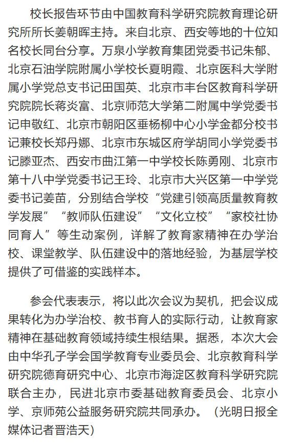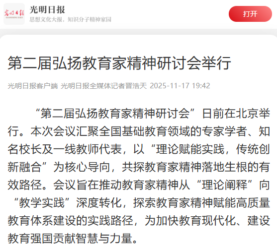 2025年11月17日,《光明日报》客户端报道第二届弘扬教育家精神研讨会举行