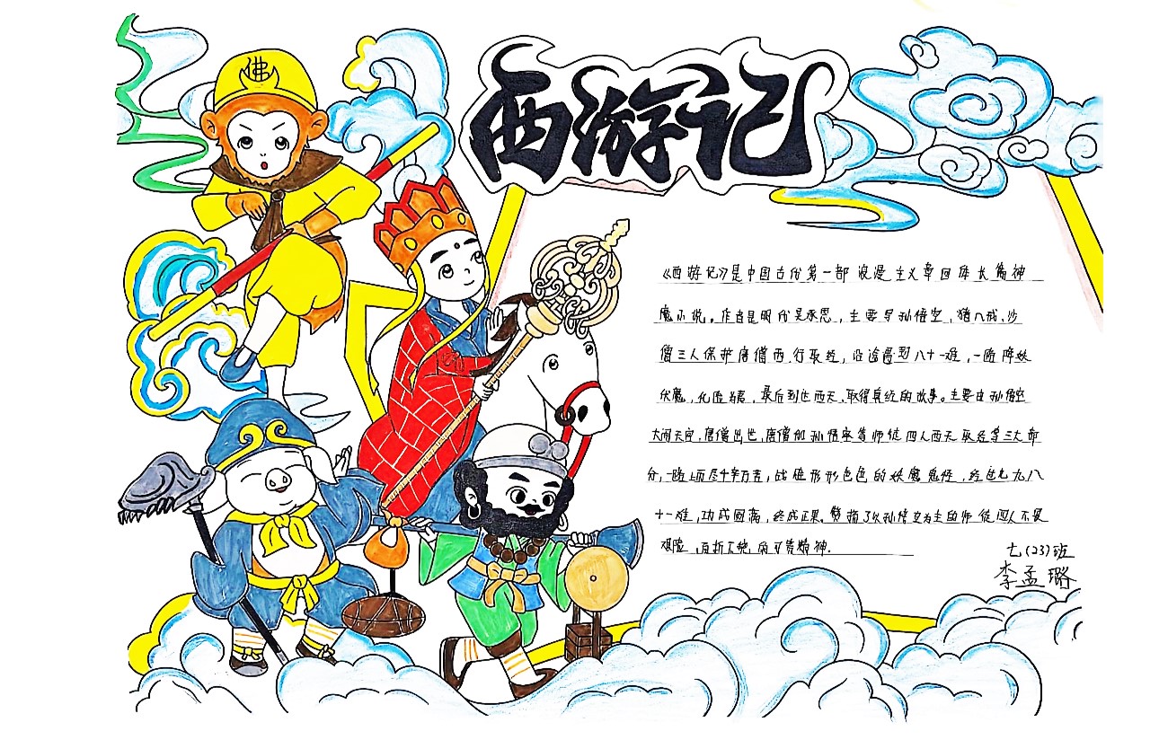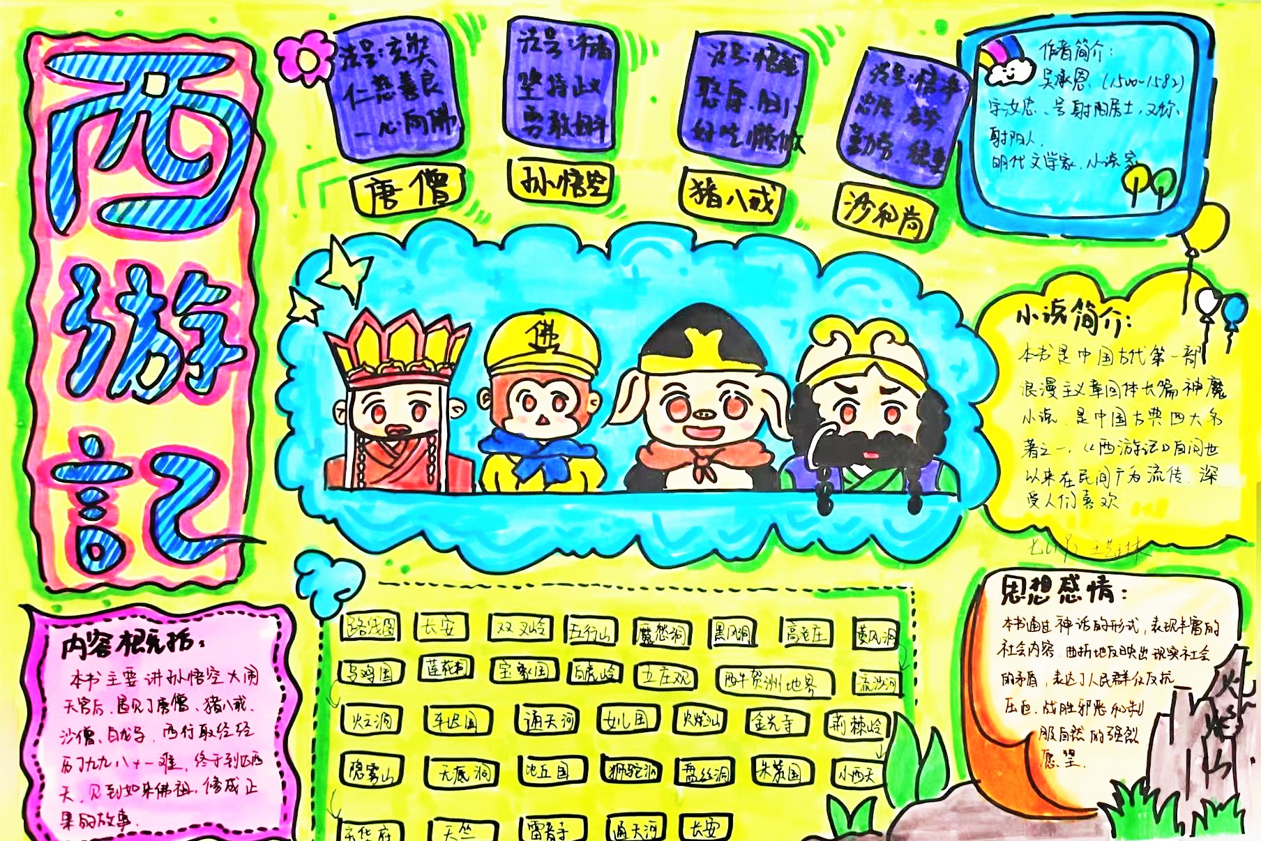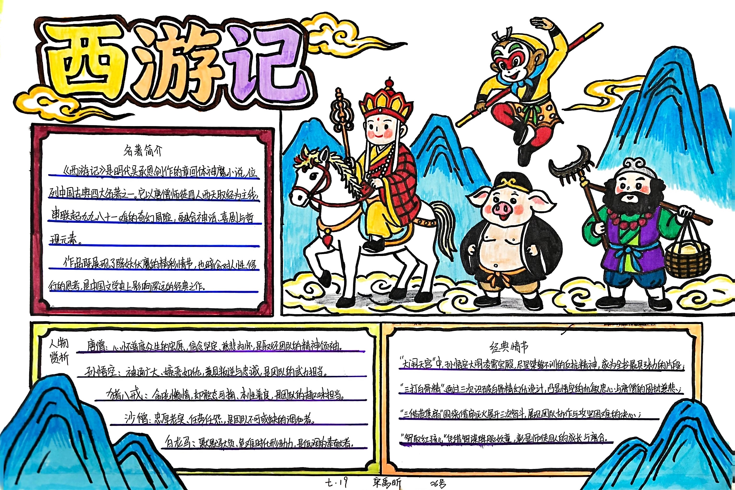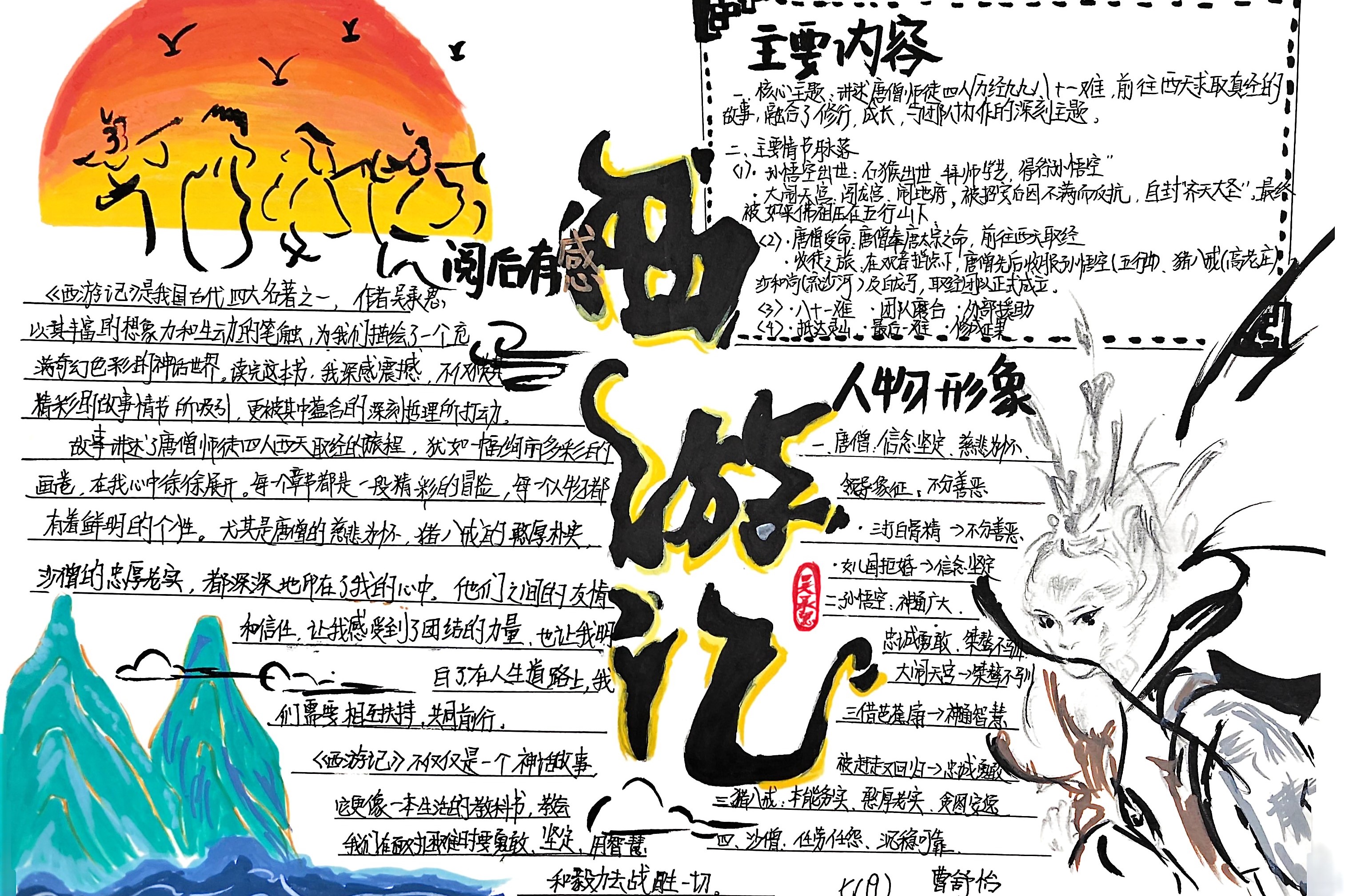 一张张手抄报构思精巧,创意盎然。有的聚焦“三打白骨精”“大闹天宫”“智取红孩儿”等经典情节,人物形象鲜明,场景刻画细腻,仿佛将读者带入那个奇幻诡谲的神魔世界;有的围绕师徒四人的性格特质展开解读——从唐僧的坚定执着、孙悟空的智勇双全,到猪八戒的憨态可掬、沙和尚的忠厚沉稳,字里行间流淌着同学们对角色的个性化理解;还有的另辟蹊径,以“取经精神”为核心,将不畏艰险、团结协作的品质与当下的学习成长相联系,赋予经典全新的时代意义。