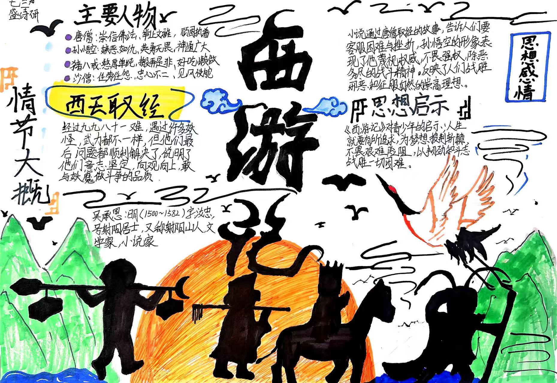 一笔丹青绘神魔,一纸素笺话西游。为丰富校园文化生活,引导学生走进古典名著的瑰丽世界,感受中华优秀传统文化的独特魅力,曲江一中初2025级开展了“手绘取经路,心悟西游情”主题手抄报展示活动。同学们以笔为媒,以纸为桥,将《西游记》中的经典故事与深刻哲思化作一幅幅妙趣横生的画卷,让名著的墨香流淌校园,为校园增添了浓郁的书香气息。
