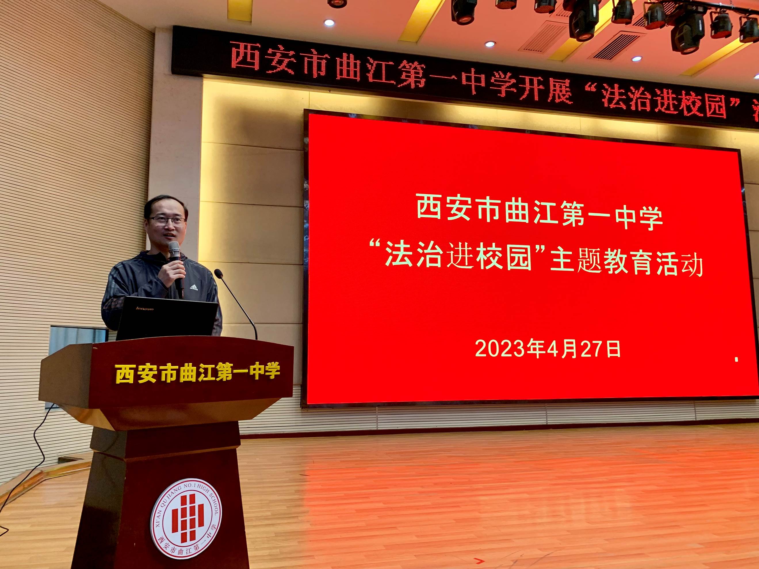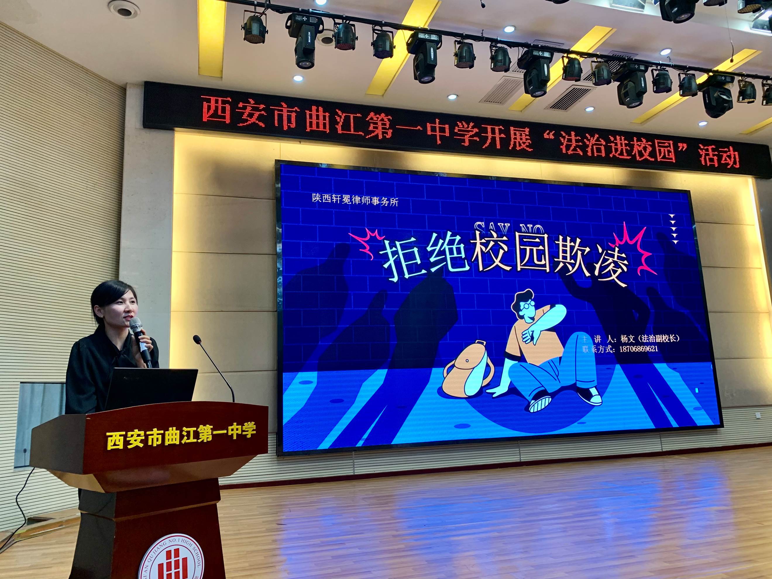 为加大校园法治教育力度,提高学生的法治意识,营造文明、平安、和谐的校园育人环境,4月27日下午,西安市曲江第一中学在润德厅举办“法治进校园”专题活动。陕西轩冕律师事务所刑事业务部主任、曲江一中法治副校长杨文律师为初2020级学生带来《拒绝校园欺凌》专题讲座,此次讲座由政教处副主任董锋主持。